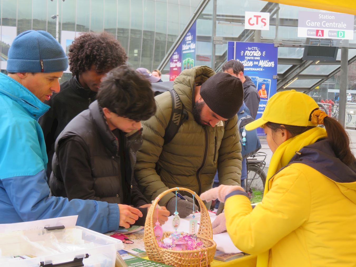 當天下午,法輪功學員在斯特拉斯堡火車站廣場,進行了講真相和徵簽活動。