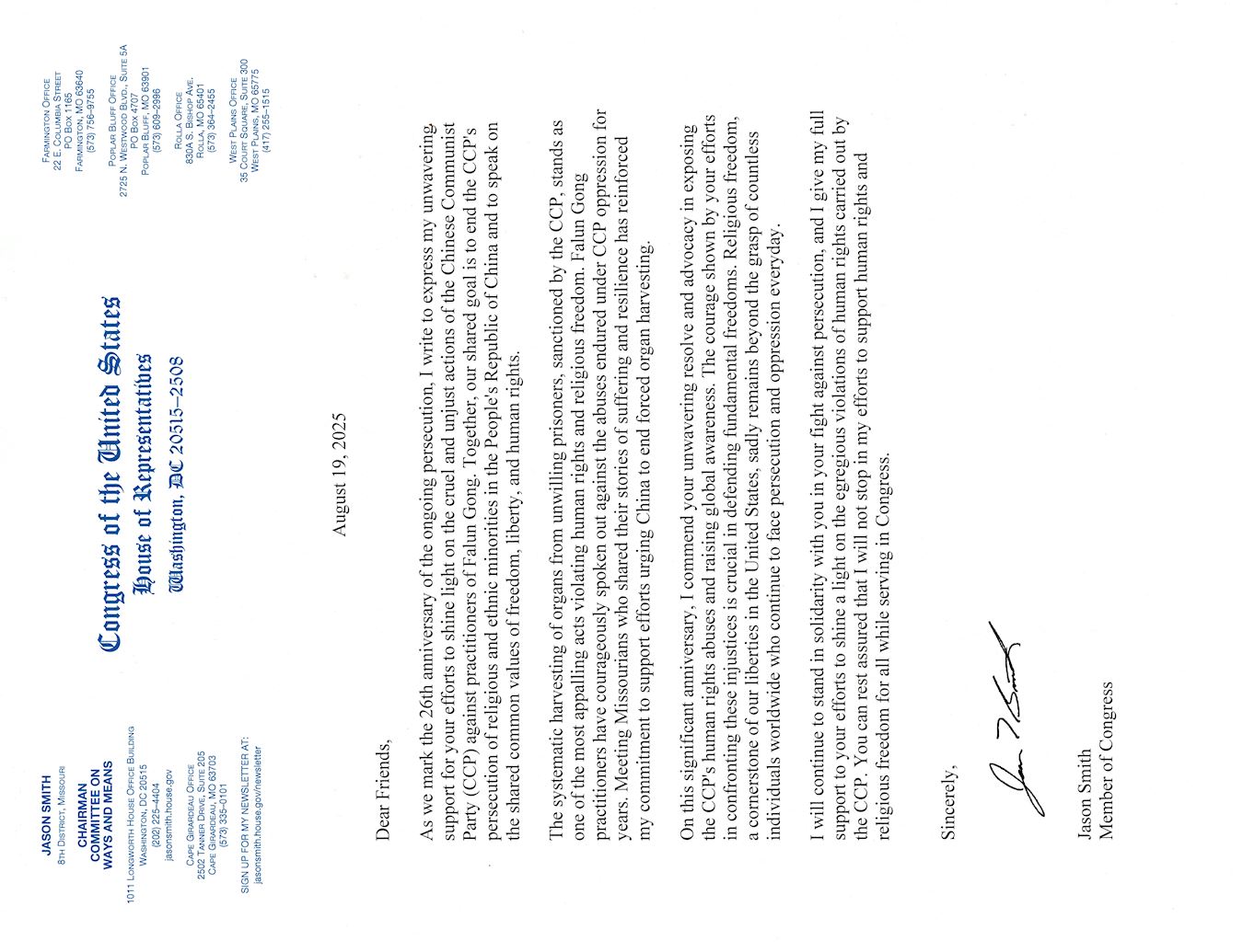 在法輪功學員反迫害二十六週年之際,我致函表達對你們的堅定支持。你們一直堅持不懈的揭露中共殘酷與不公的迫害。我們共同的目標都是結束中共對信仰團體和少數族裔在中國國內的鎮壓,並且表達我們自由、解放和人權的共同價值。