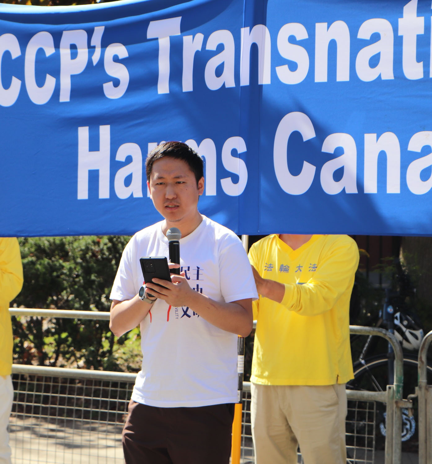 中國民主黨加拿大委員會理事劉岩在集會上發言,他說:「我們有權利自由地表達觀點;我們有權利追求真、善、忍的信仰;我們有權利批判獨裁;我們有權利反對中共;我們有權利享受自由、民主和生而為人的尊嚴。」他呼籲各界團結起來,反對中共的滲透,反對跨國鎮壓,捍衛自由。