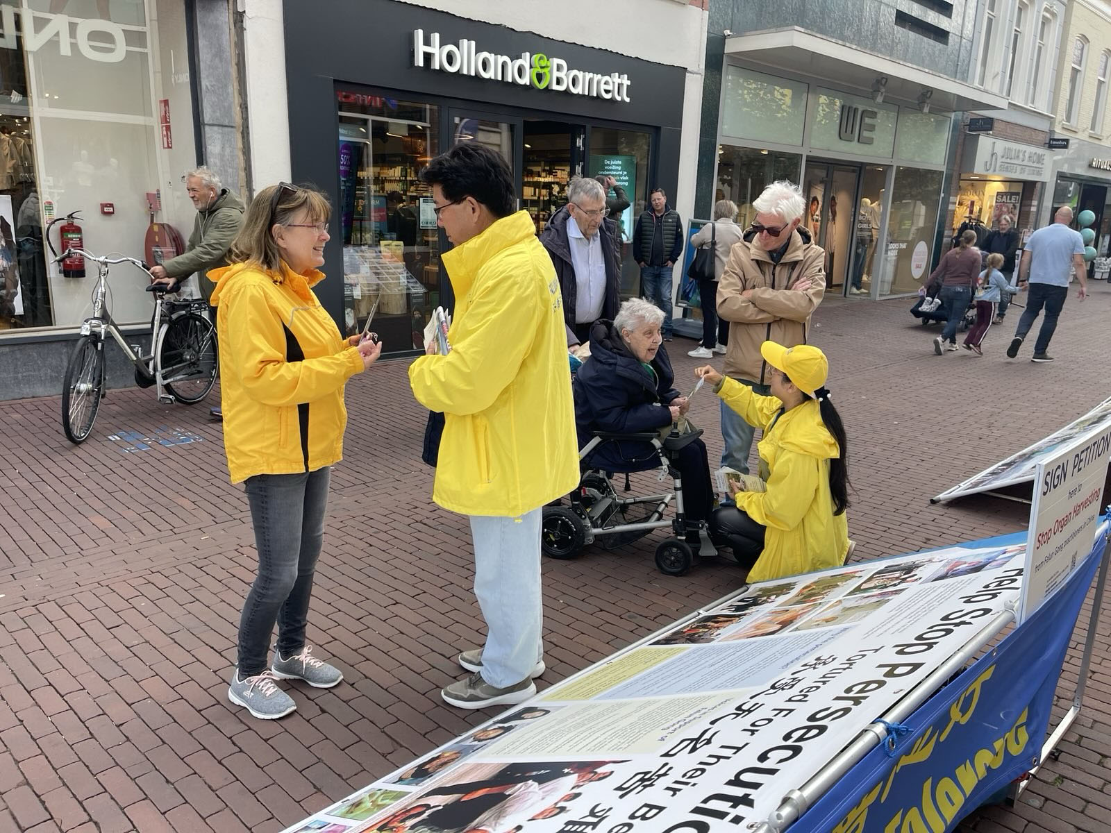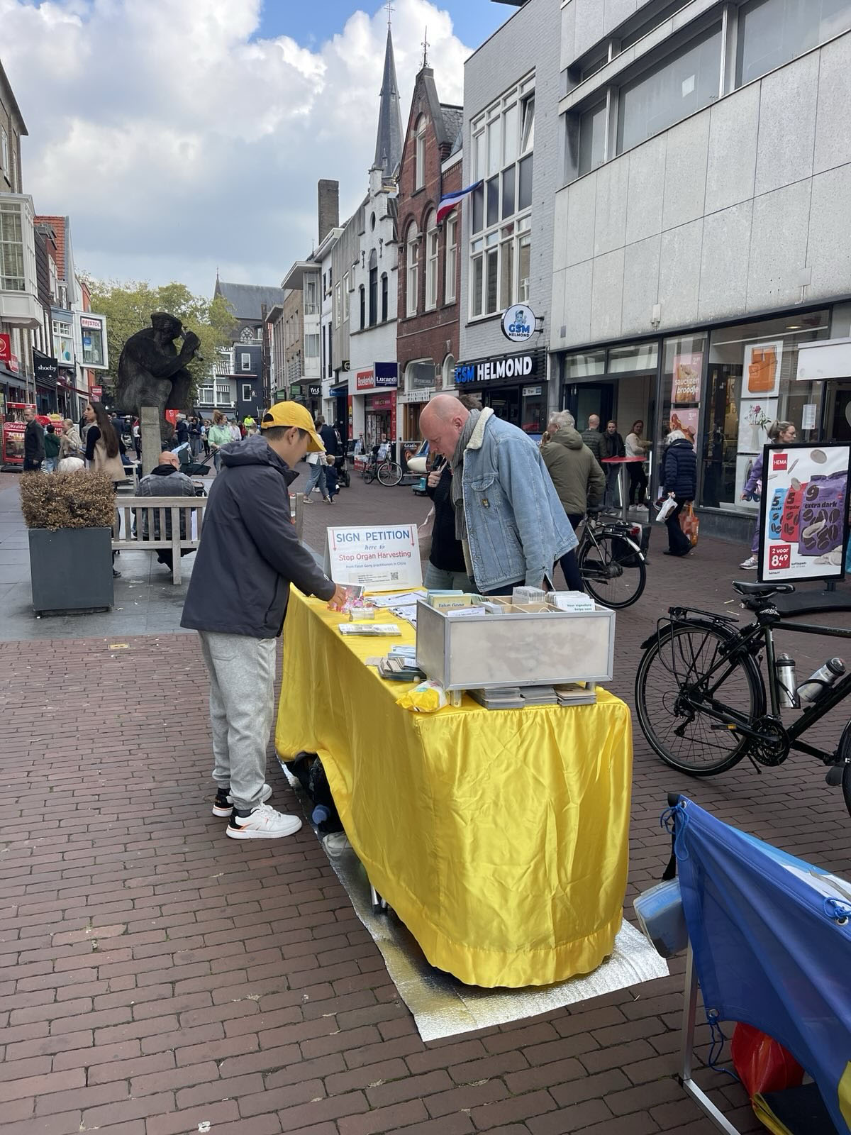 赫爾蒙德是荷蘭北布拉班特省(Noord Braband)的一個城市。中午時分,學員們在赫爾蒙德市場街(Markt)布置真相展板,展示法輪功五套功法,與民眾交談,向民眾徵集反對迫害的簽名。