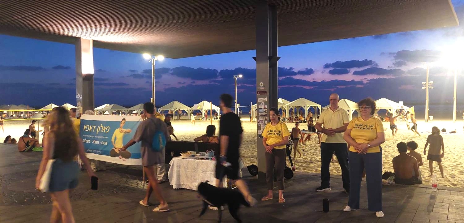 活動從下午六點持續到八點半,學員們演示功法、發放資料並徵簽反對活摘器官等。許多以色列民眾駐足了解真相,在徵簽表上簽名。