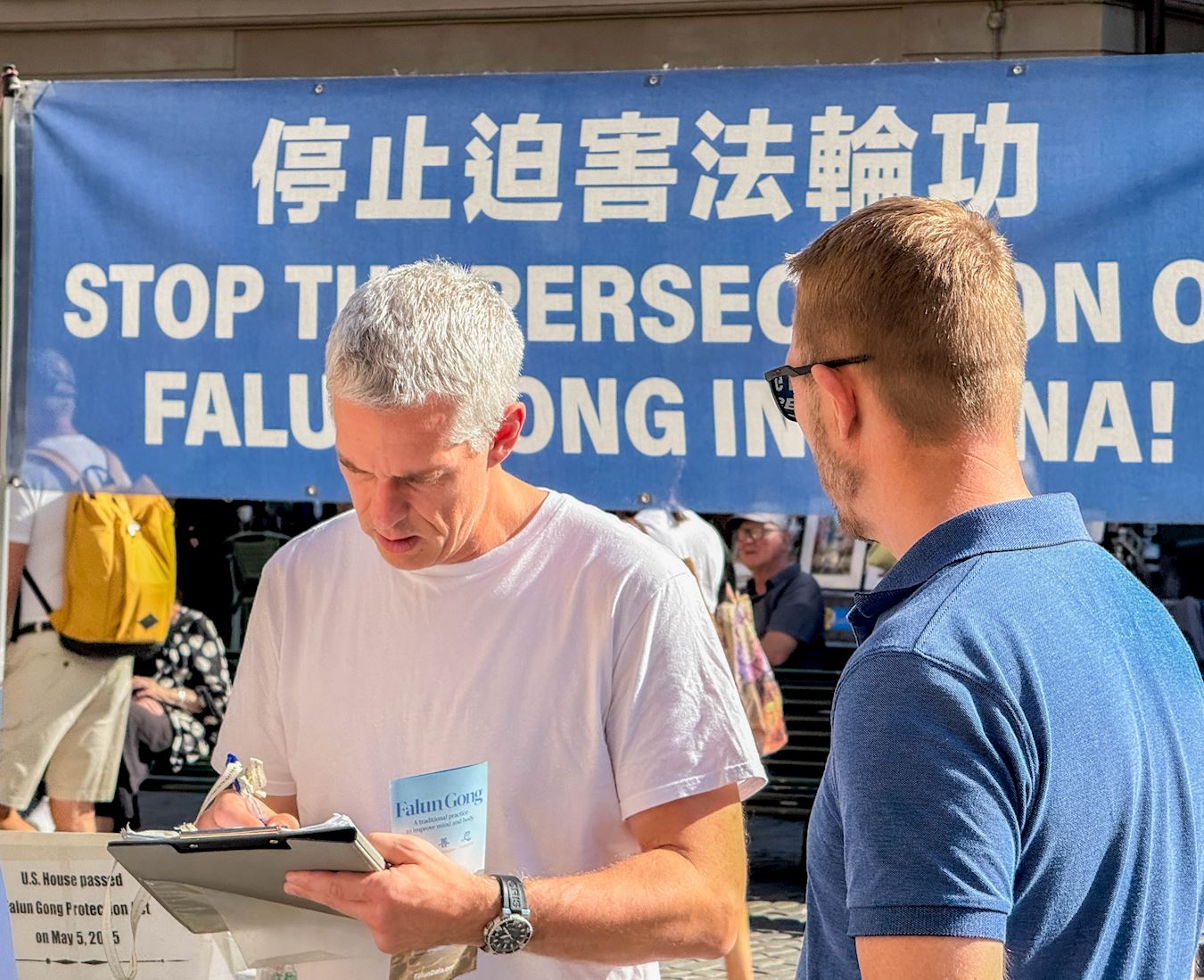 一對父子在徵簽表上簽了名。父親說:「這正是我們現在需要的:真、善、忍。我們已經厭倦了分裂、仇恨和爭鬥,我們不再需要這些了。」