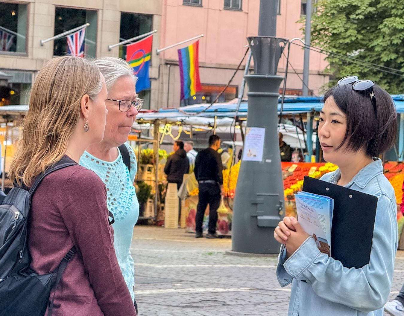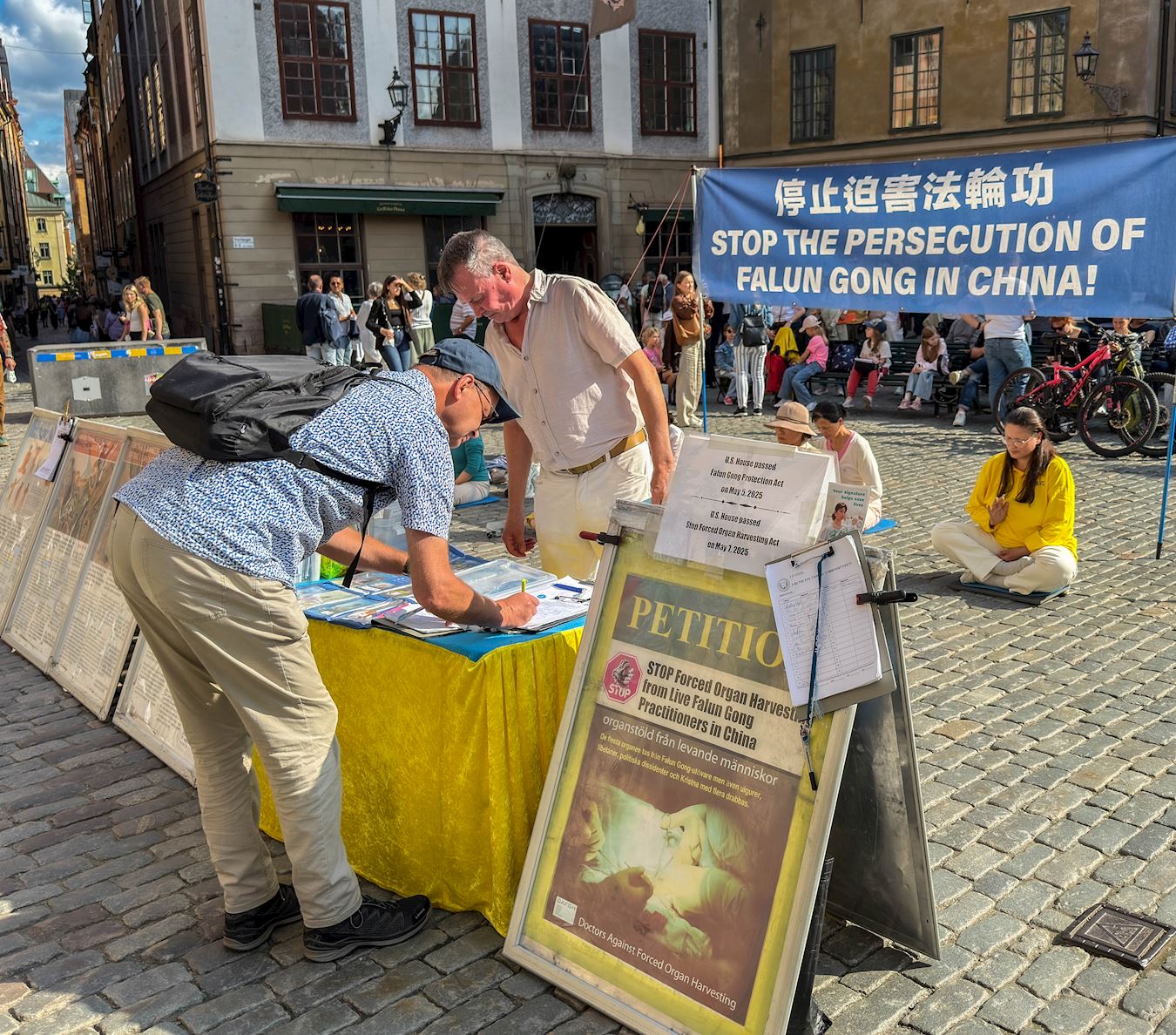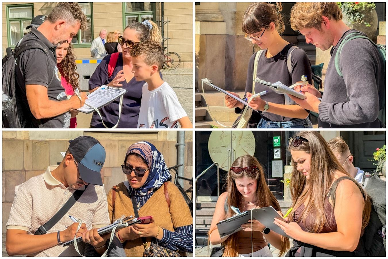 二零二五年九月五日和七日的下午,法輪功學員在諾貝爾博物館前的真相攤位還沒有完全擺放好,許多當地市民和遊客就圍上來想了解詳情,人們都主動接真相資料、觀看信息展板或與學員交談,很想進一步深入了解法輪功,以及中共迫害法輪功的真相和有關活摘器官的資訊。人們明白真相後都主動接過簽字簿來簽名,表示很願意為結束迫害助一臂之力。