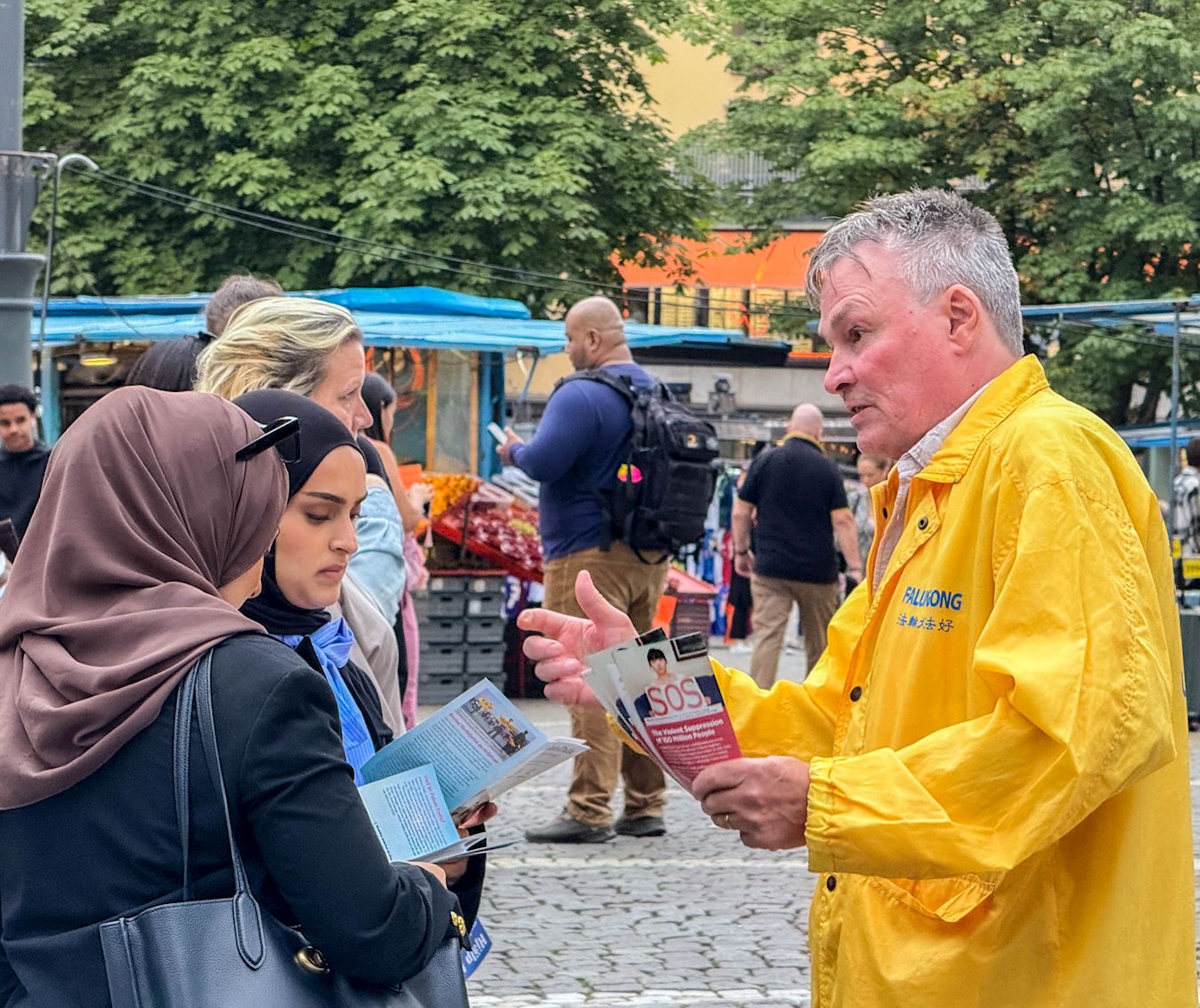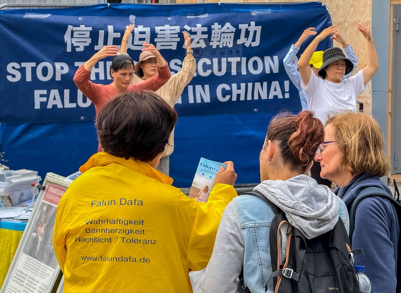 一對年輕男女走近另一位學員,男青年說自己知道法輪功的事情,還希望同伴也能聽到真相。