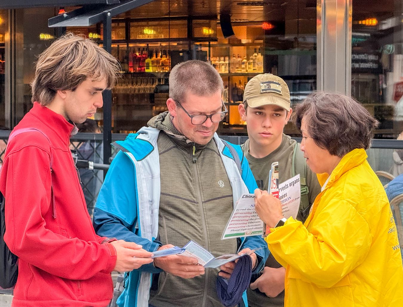 來自西班牙的父子三人經過活動現場時,通過和學員的交談,了解了法輪功真相以及中共為甚麼要強摘法輪功學員器官的事實真相後,不禁脫口而出:「這是在犯罪、如何能幫助制止?」他們滿臉充滿了驚訝和對正在遭受中共迫害的法輪功學員的同情。當父子三人都簽署了反迫害的請願書後,顯得很開心。臨走時,那位父親雙手合十,向法輪功學員堅持講真相反迫害的勇氣和毅力深表敬佩。