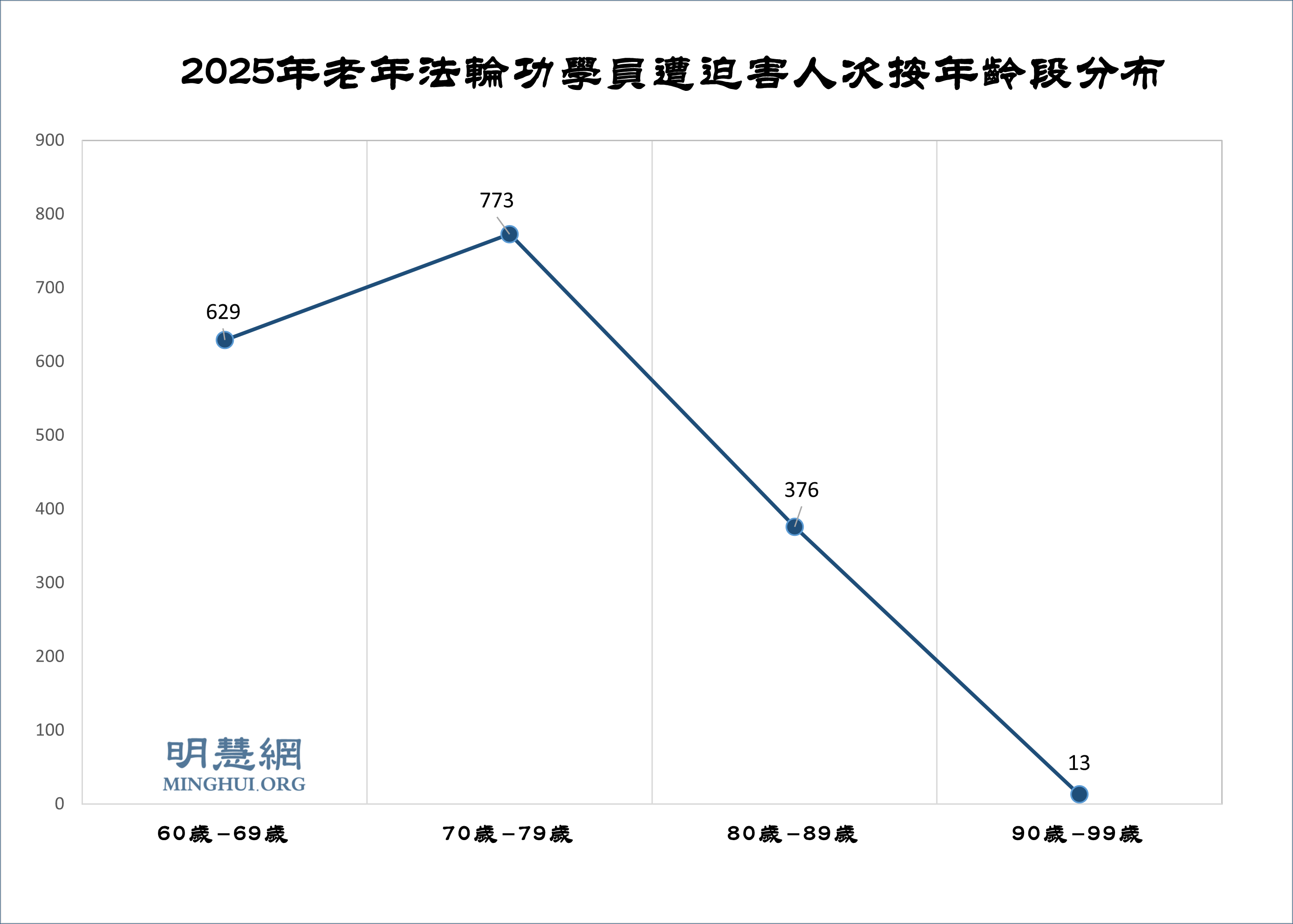 據明慧網二零二五年不完全統計:二零二五年獲知中國大陸法輪功學員遭中共非法判刑的至少有751人,已知年齡的一共498人,其中370名是60歲以上老年法輪功學員──90歲以上1人,80~90歲33人,70~80歲156人,60~70歲180人。綁架騷擾法輪功學員4803人,其中知道年齡、60歲以上法輪功學員947人,實際老人人數至少一半以上。