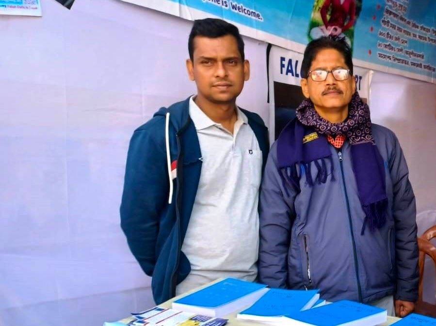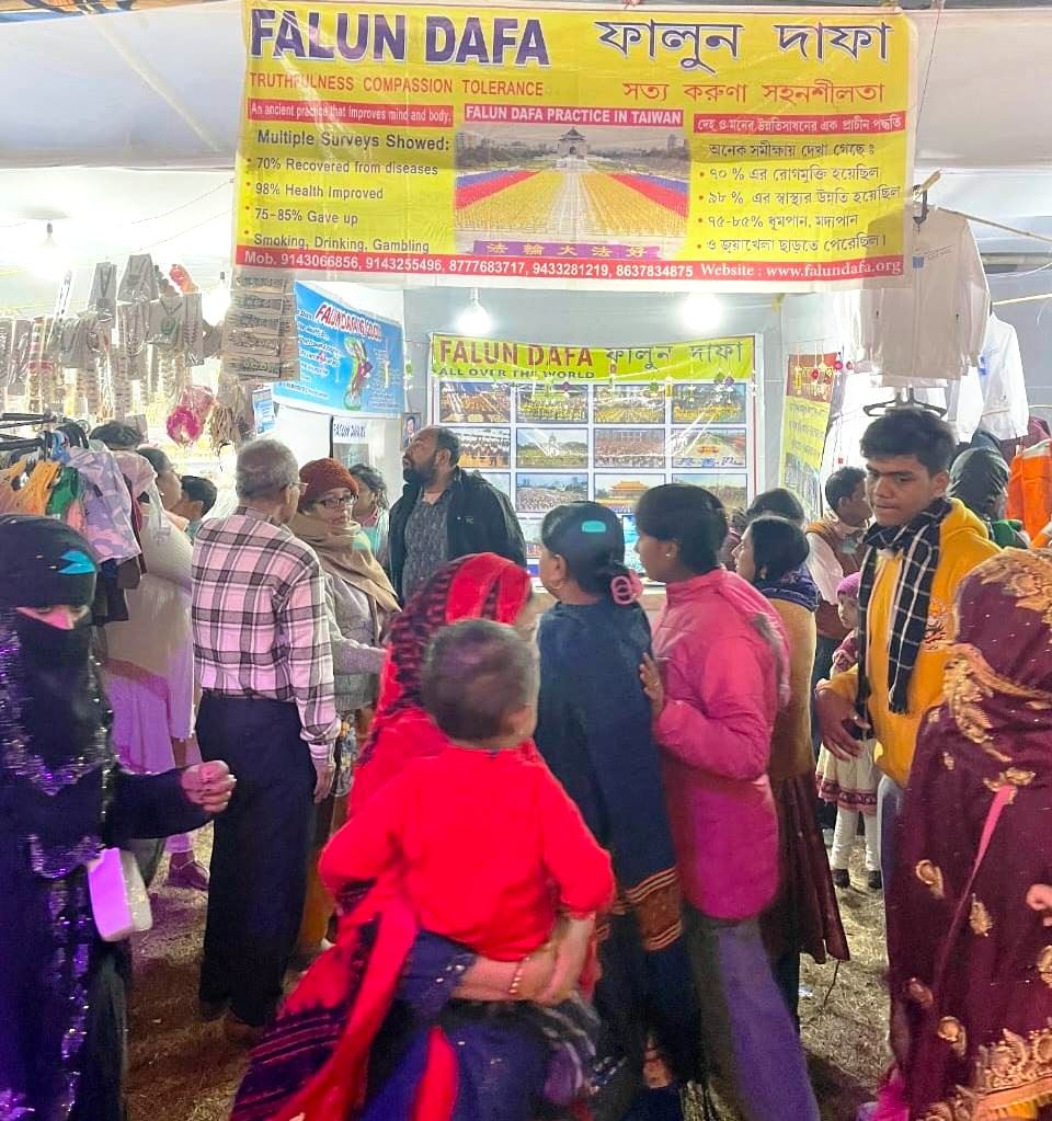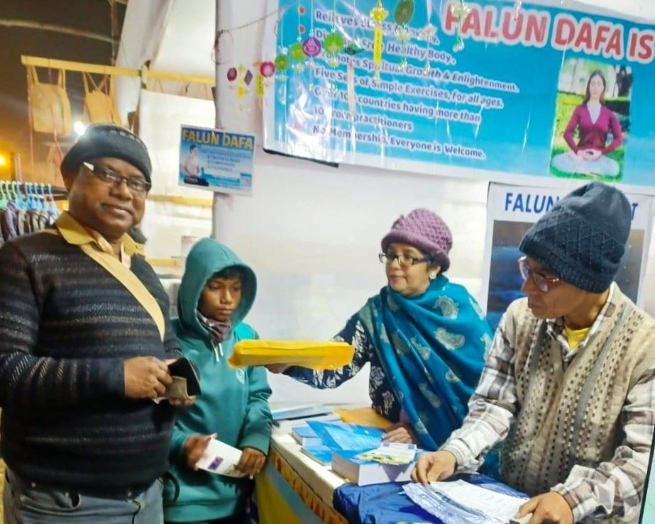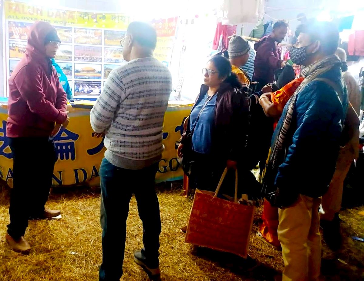 來自加爾各答的法輪功學員驅車212公里前往集市設展位,向成千上萬的參觀者介紹法輪大法,希望與其他印度人分享這一讓他們受益匪淺的功法。
