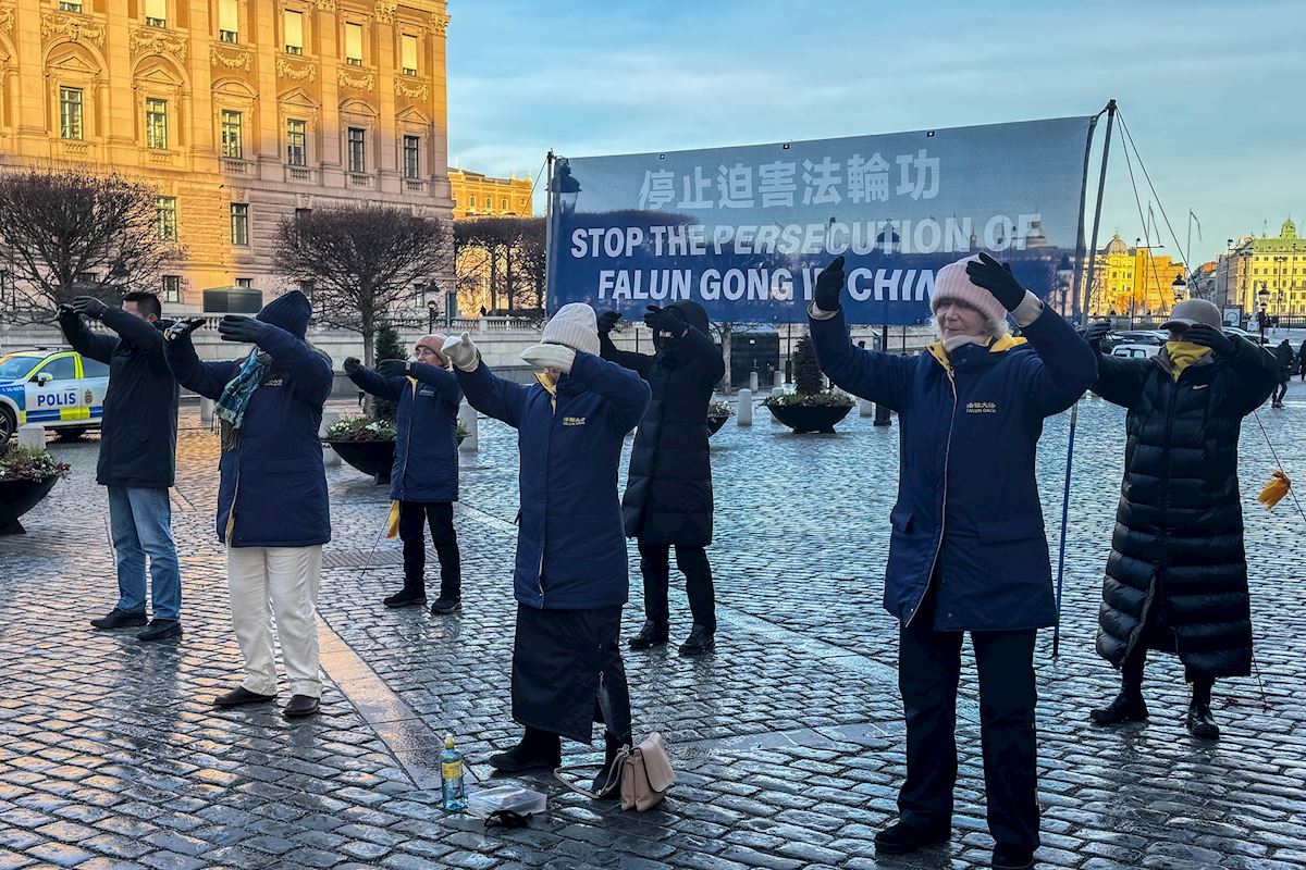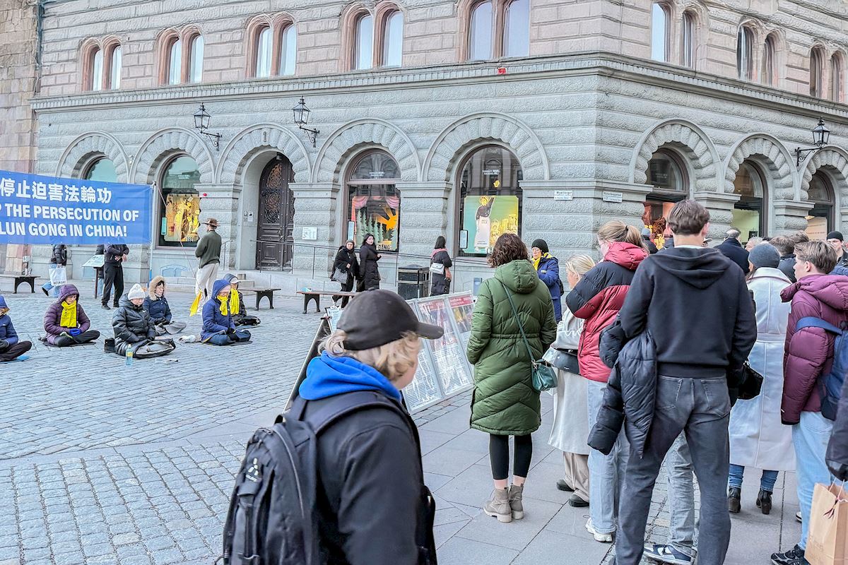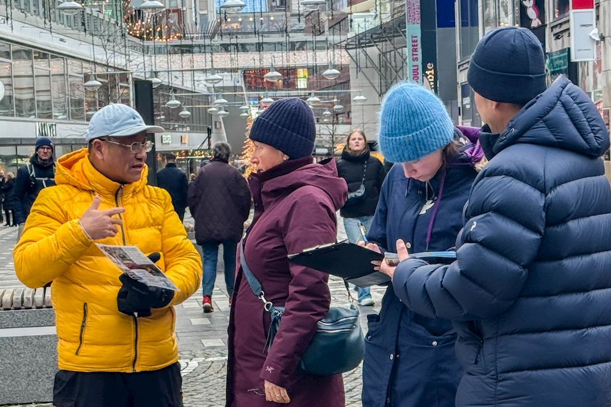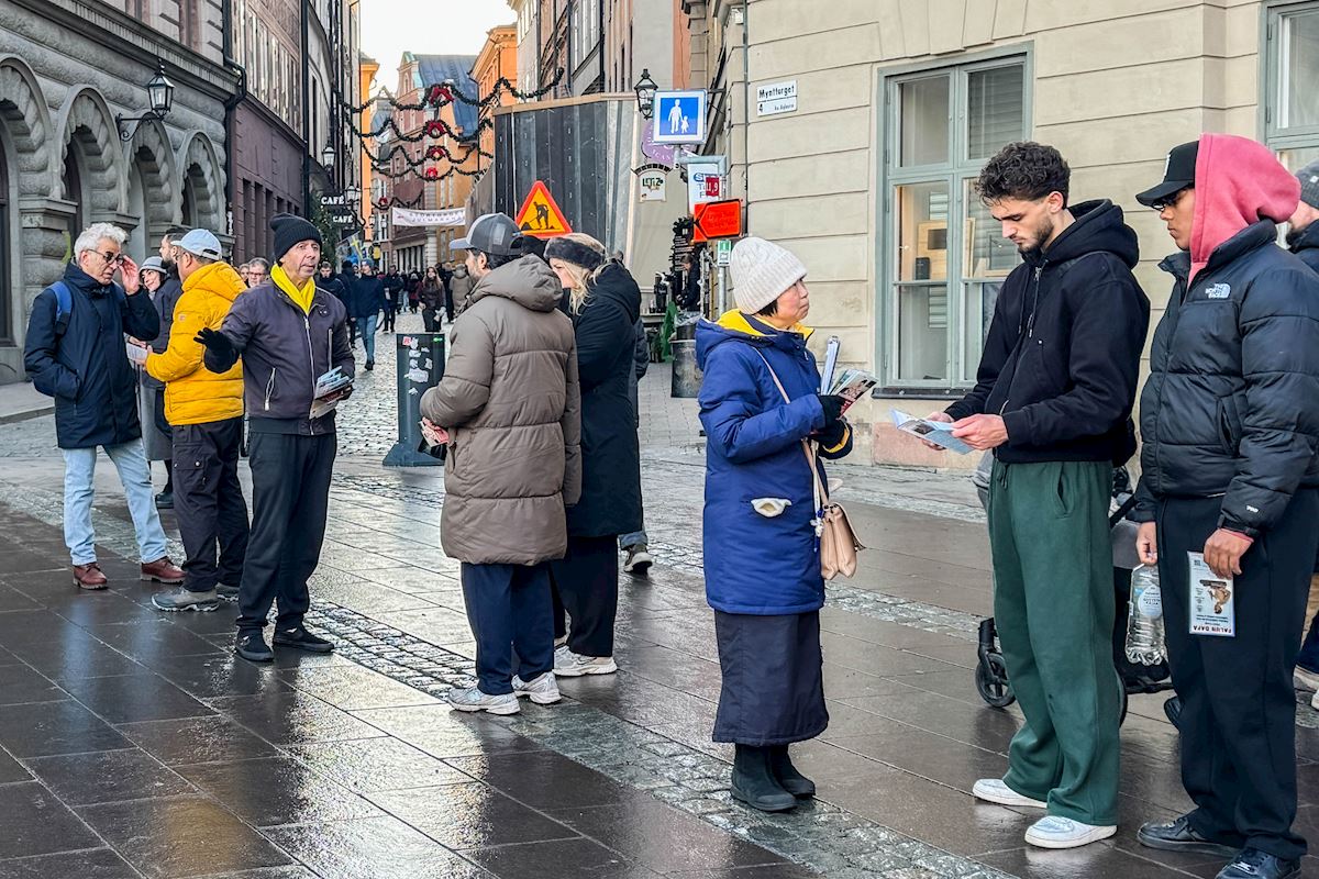 二零二五年十二月份每個週五和週六下午,法輪功學員分別在斯德哥爾摩最熱鬧的皇宮旁的錢幣廣場、著名的斯德哥爾摩音樂廳旁舉辦了法輪功功法演示、講真相和徵簽活動。他們希望借助這個特殊的時刻,向更多人揭露中共對大陸法輪功學員的迫害和企圖延伸至海外跨國鎮壓的罪行。