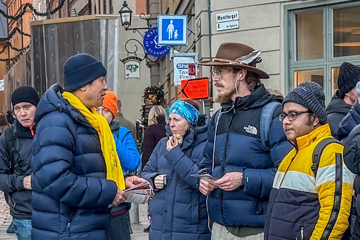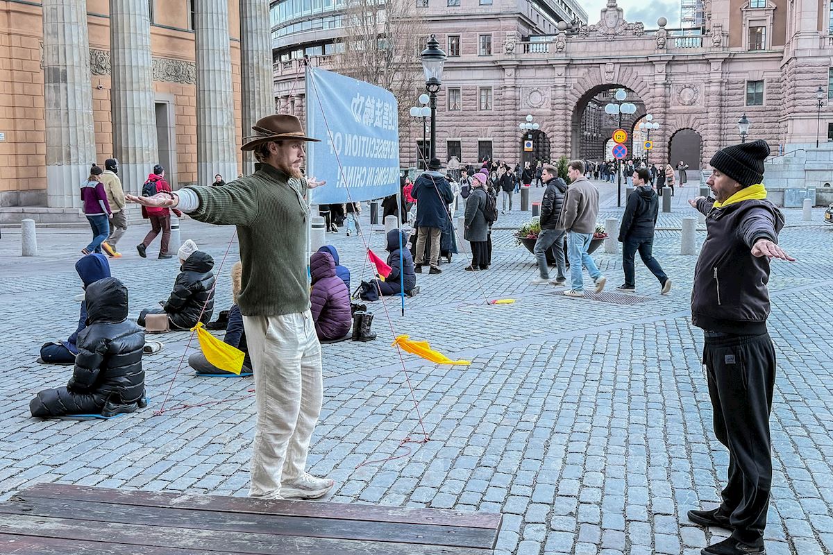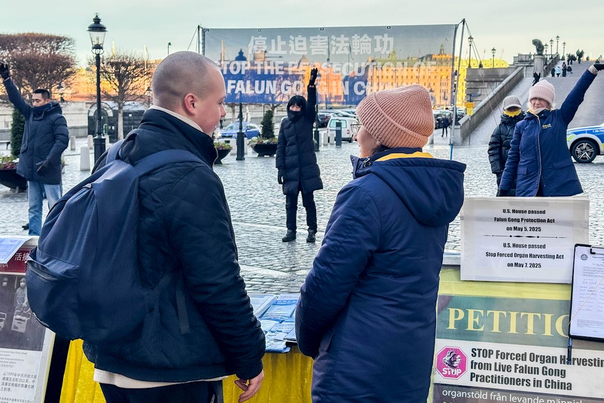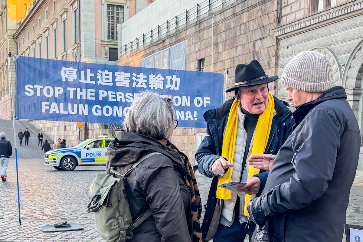 二零二五年十二月份每個週五和週六下午,法輪功學員分別在斯德哥爾摩最熱鬧的皇宮旁的錢幣廣場、著名的斯德哥爾摩音樂廳旁舉辦了法輪功功法演示、講真相和徵簽活動。他們希望借助這個特殊的時刻,向更多人揭露中共對大陸法輪功學員的迫害和企圖延伸至海外跨國鎮壓的罪行。