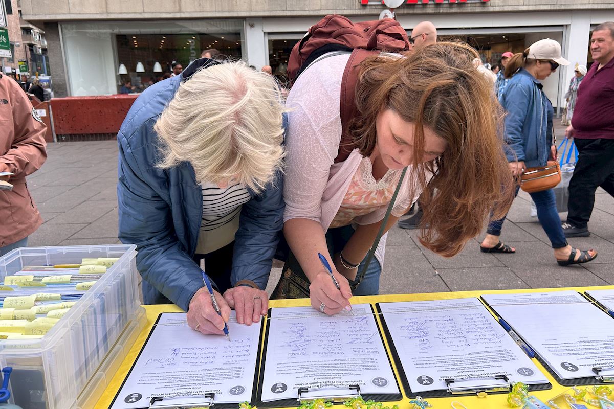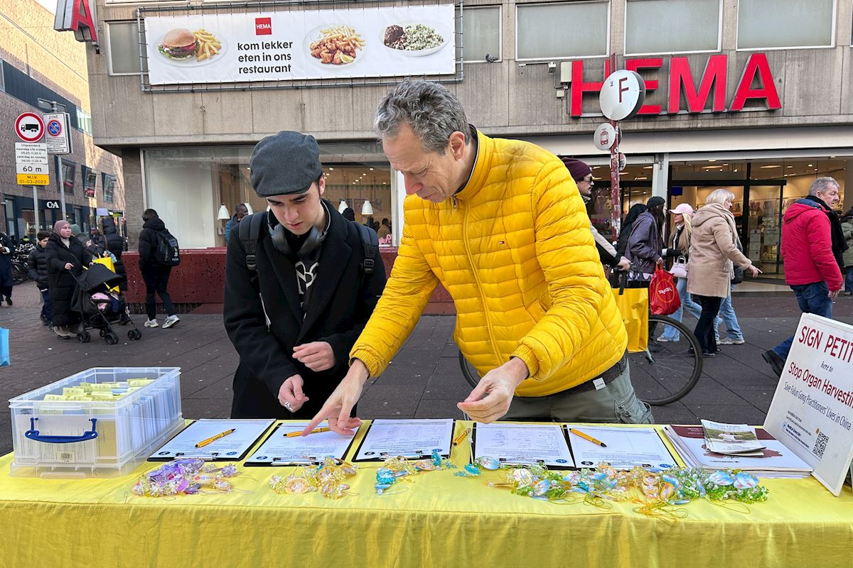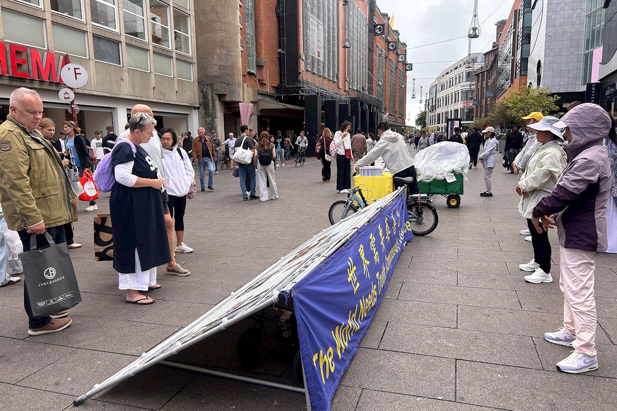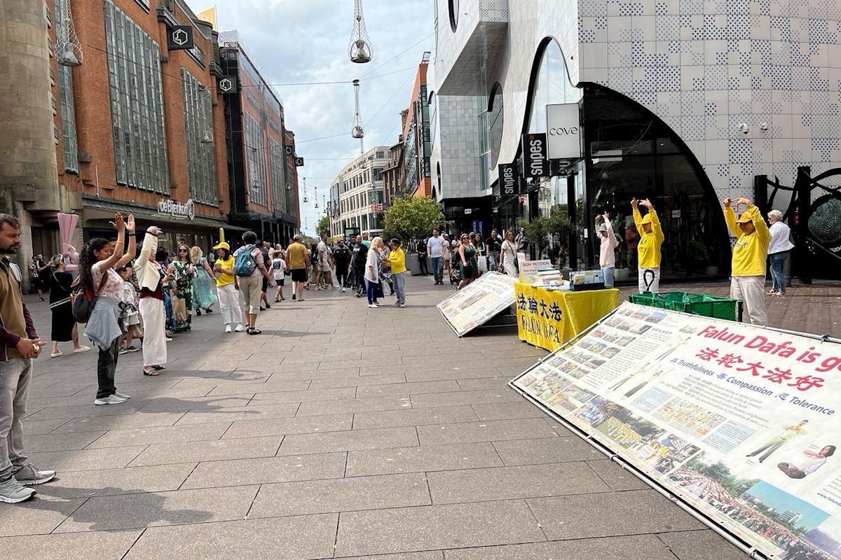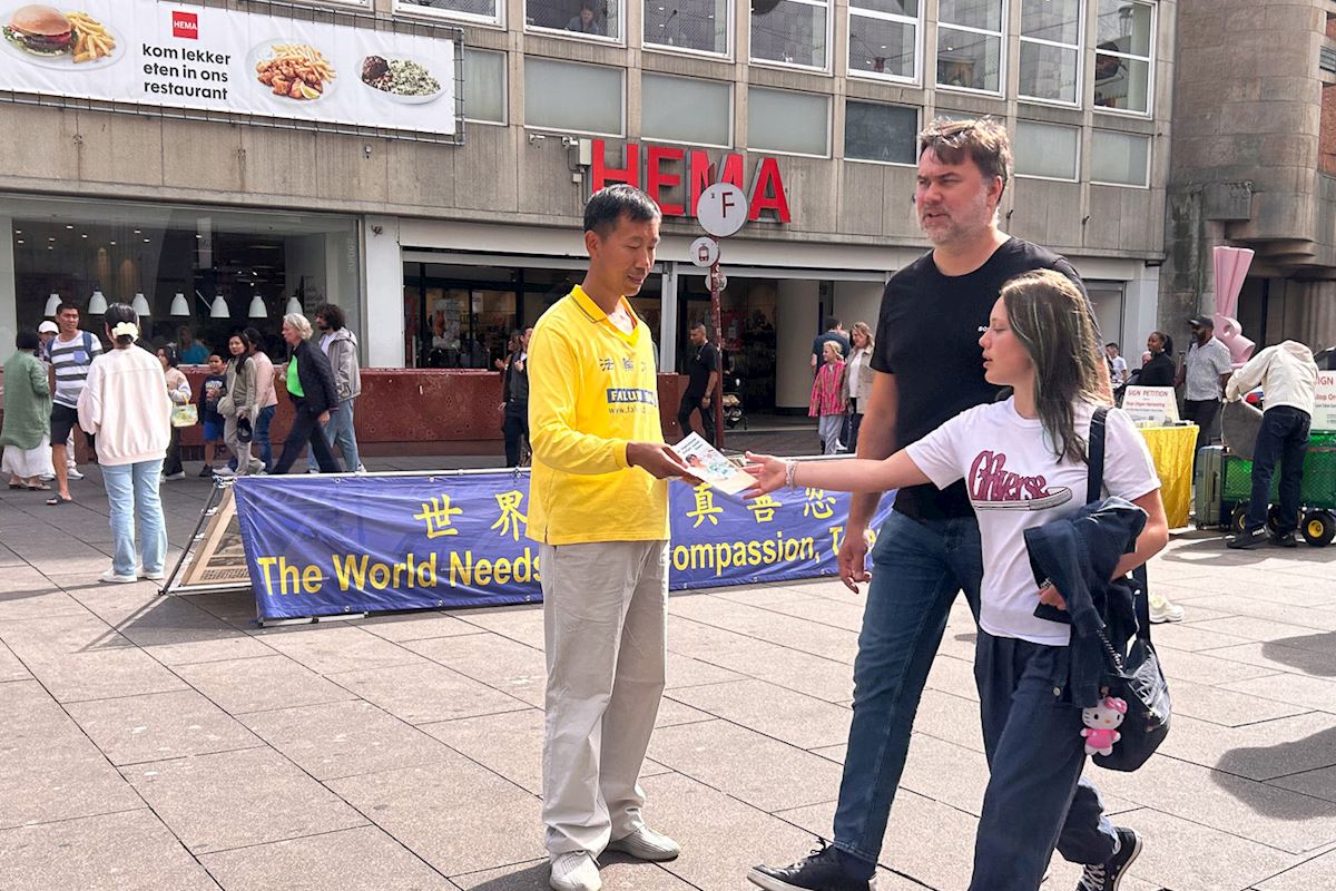 每到週末,在海牙市中心商業街(Grote Markststraat),荷蘭法輪功學員都會固定舉行活動。展示法輪功的五套功法,派發傳單,與人交談。來往的商務人士、學者、留學生、人權組織工作者、國際遊客在這裏聽聞大法真相,了解了中共對法輪大法修煉人持續至今的殘酷迫害。許多第一次聽說的人感到震驚,也有了解真相的人表達對法輪功學員的支持和欽佩。