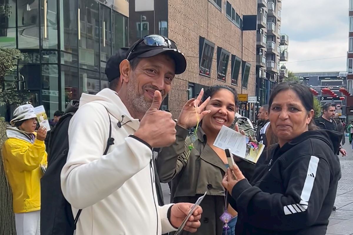 兩位荷蘭萊頓大學的教授走過來詢問是否有中文的資料,他們在萊頓大學生物專業執教,接觸到中國來的博士、訪問學者,發現他們對中國發生的人權迫害並不了解,他們想帶些真相資料給那些中國同事,幫助他們獲得真實的信息,打開思想的桎梏。