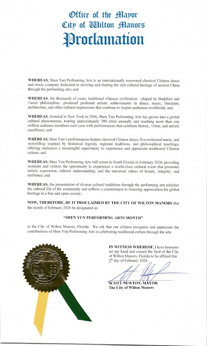 特此在佛羅里達州威爾頓﹒馬納斯市頒布。我們呼籲全體市民認識並讚賞神韻藝術團通過藝術形式弘揚傳統文化所作出的貢獻。