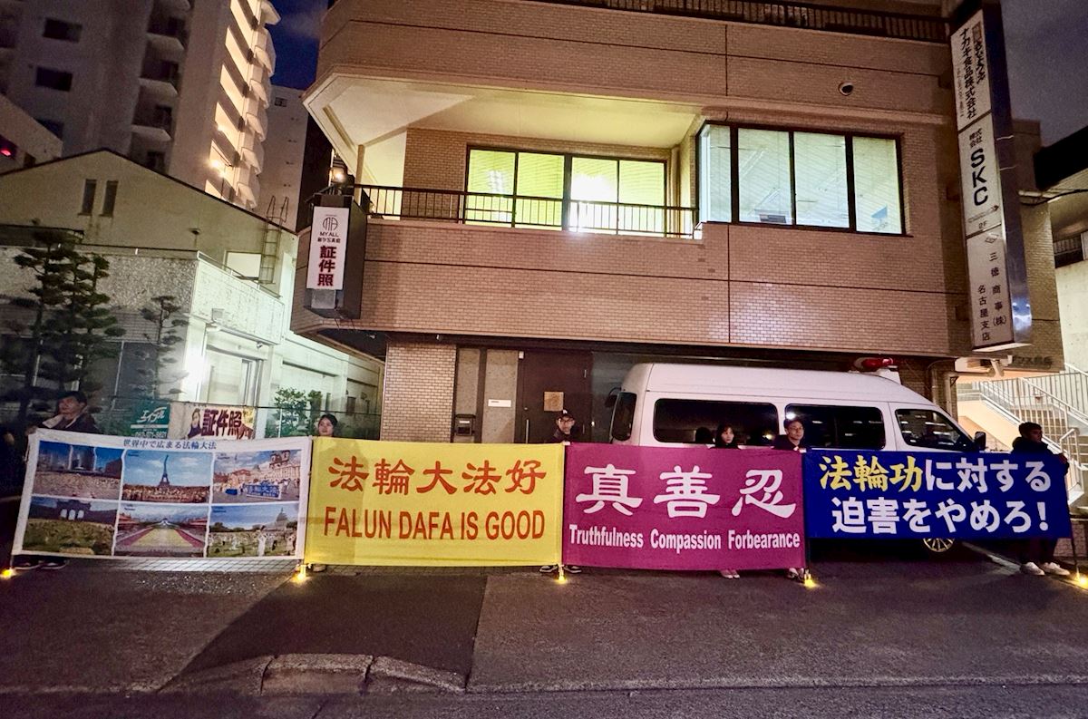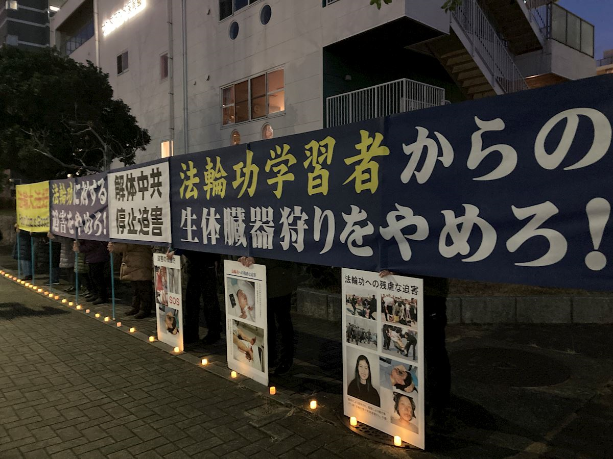 當晚,學員們在寒風中整齊地站在人行道旁,面對領事館展開「法輪大法好」「立即停止對法輪功的迫害」「立即停止對法輪功學員的活摘器官」等橫幅,並擺放「停止對法輪功的迫害」「善惡必報」「STOP!活摘器官」等中日文標語牌和真相展板。
