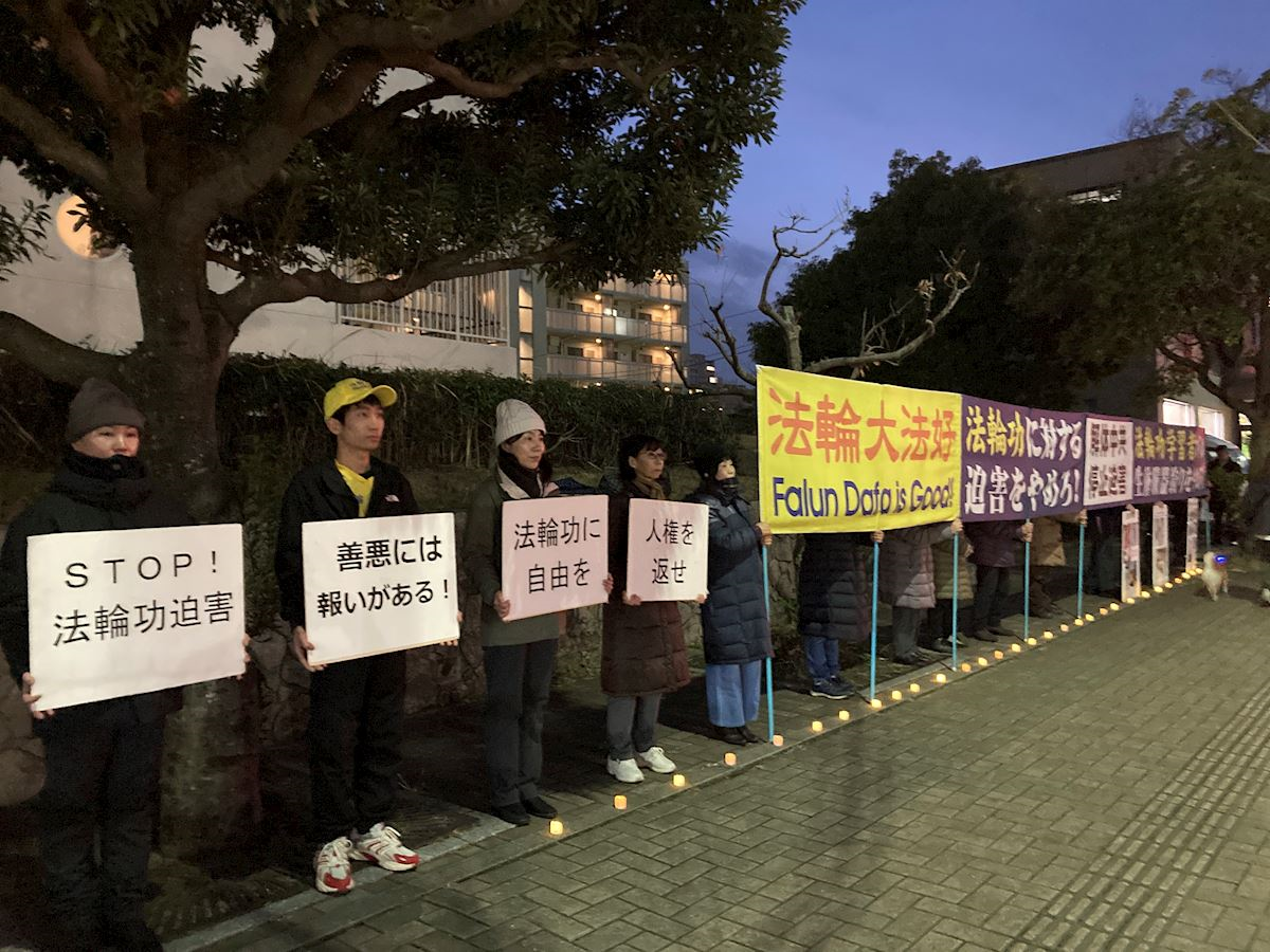二零二六年二月十六日除夕夜,萬家燈火、闔家團圓之際,日本熊本地區的法輪功學員和往年一樣,再次來到駐福岡中國領事館前,舉行和平抗議活動,呼籲國際社會關注並制止長達二十七年的迫害。