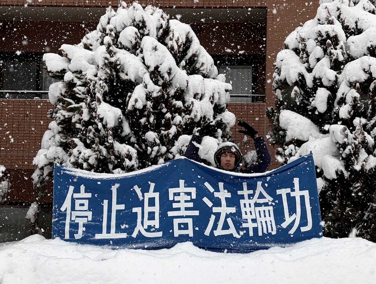 日本最北部北海道札幌的法輪功學員也在二月十六日除夕當天下午來到札幌中領館前,在雪中打出「停止迫害法輪功」的橫幅呼籲停止迫害。
