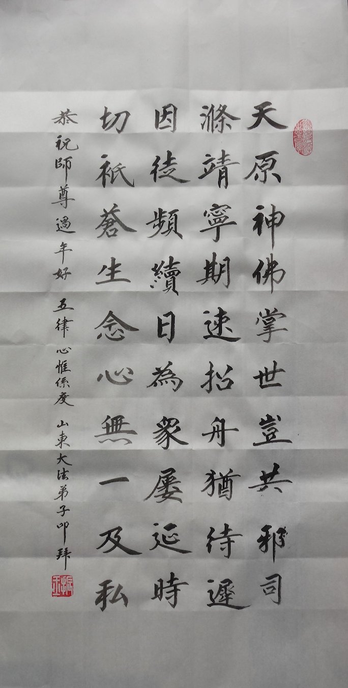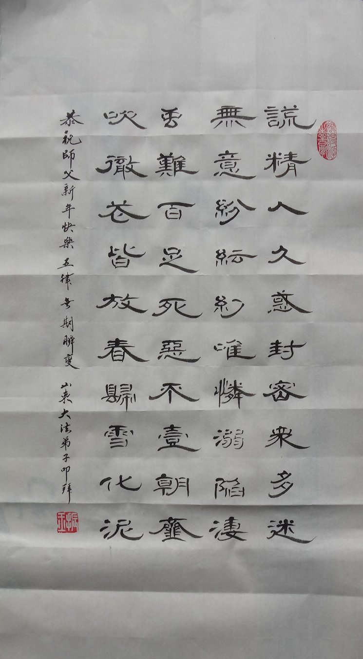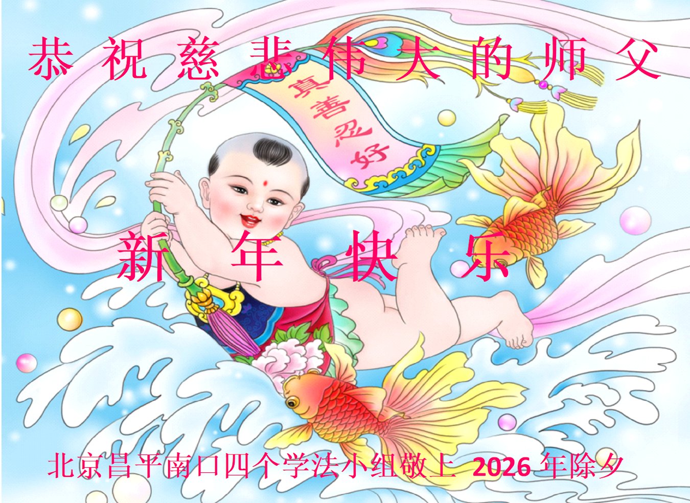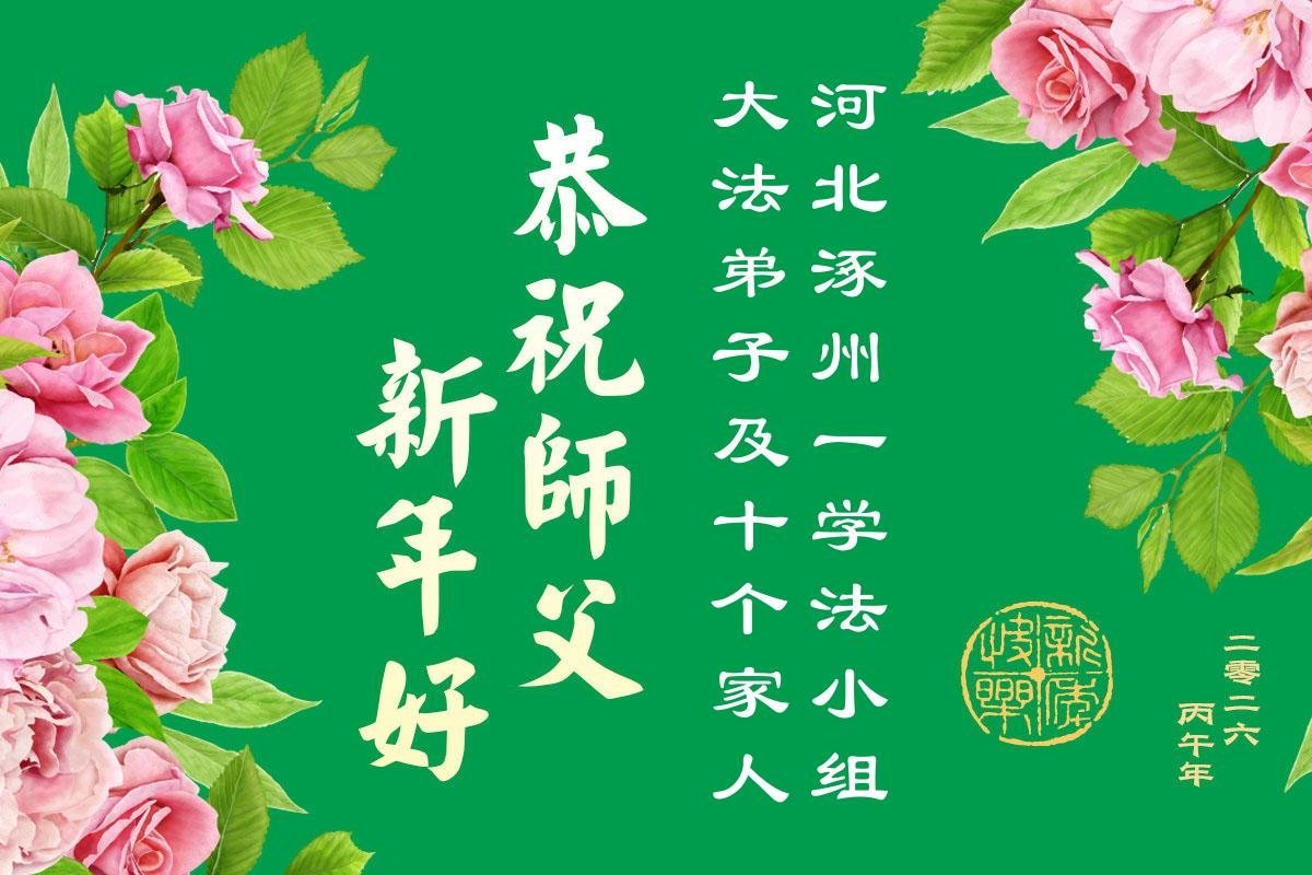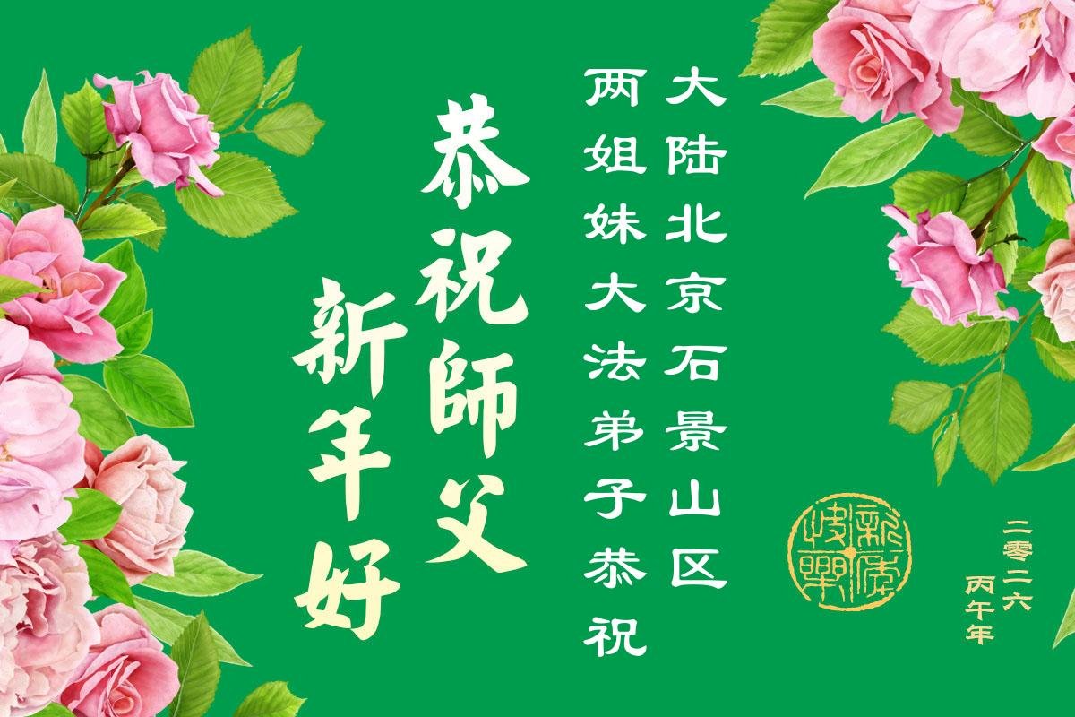 在新的一年到來之際,我們北京學法小組全體大法弟子向慈悲偉大的師尊拜年!師父您好!您辛苦了!我們有信心和決心在新的一年遵照師尊的諄諄教導,修去人心,做好三件事,學法修心向內找,講真相,做個名副其實的大法弟子,跟師父回家。