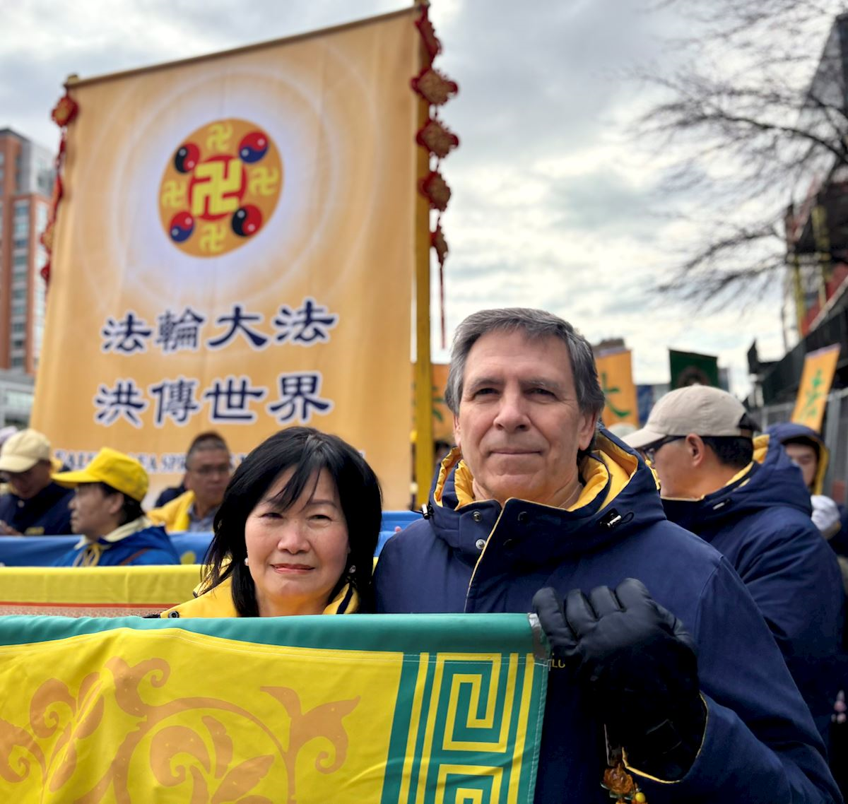 邁克・裏弗斯(Mike Revers)和太太庭瑜去年剛剛從德克薩斯州搬來紐約, 裏弗斯曾是德州休士頓的一位副警長,庭瑜退休前在台灣是一家公司的董事,他們夫婦二人當天參加了「法輪大法好」方陣打橫幅。