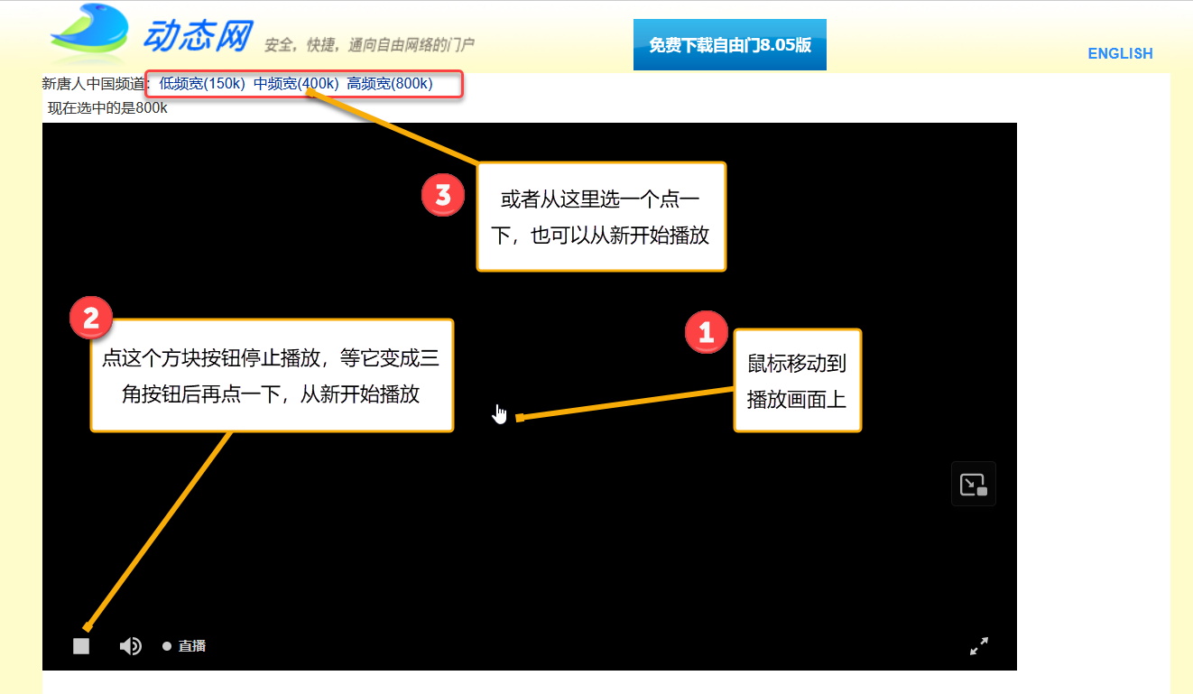 如果觀看的中途出現黑屏或者畫面卡住了,可能是正在緩衝中,可以等一會兒看看能否正常播放,如果長時間不能播放,可以把鼠標移到播放窗口上,點左邊的停止按鈕(方塊按鈕),等它變成三角按鈕後,再按一下,從新開始播放;如果出現「錯誤代碼232001」,可以點網頁上方的「低頻寬(150k)」、「中頻寬(400k)」或「高頻寬(800k)」從新開始播放。