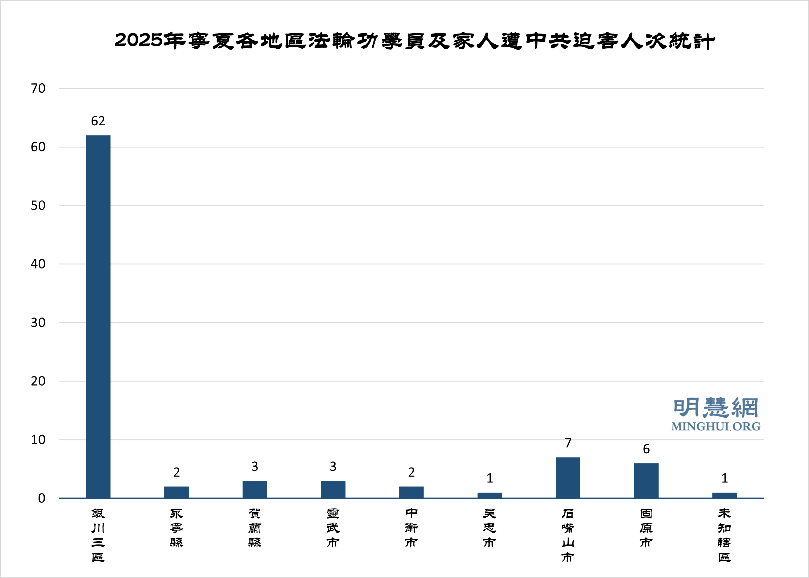 【明慧網二零二六年二月二十六日】(明慧網通訊員綜合報導)據明慧網消息不完全統計,二零二五年寧夏法輪功學員與家屬等遭受中共不法人員各種方式迫害共87人次,其中兩位被非法判刑、十一位被非法批捕、十五位被非法拘留、二十二位(包括法輪功學員的家人或鄰居)被綁架抄家或抄家、三十五位被非法騷擾一次或多次,兩位法輪功學員含冤離世。