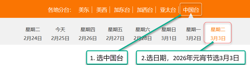 2、先點擊右上角的中國台,然後點擊日期,2026年元宵節選3月3日。如圖:
