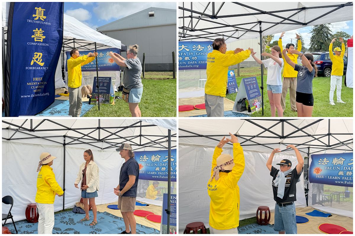 法輪功學員在現場設立展位,向過往市民介紹法輪大法,並現場展示五套功法。祥和舒緩的煉功場面吸引不少人駐足觀看,有些人當場學煉功法。一位觀眾表示,從學員的煉功場地十米開外,就能感受到一種平靜與祥和的能量。