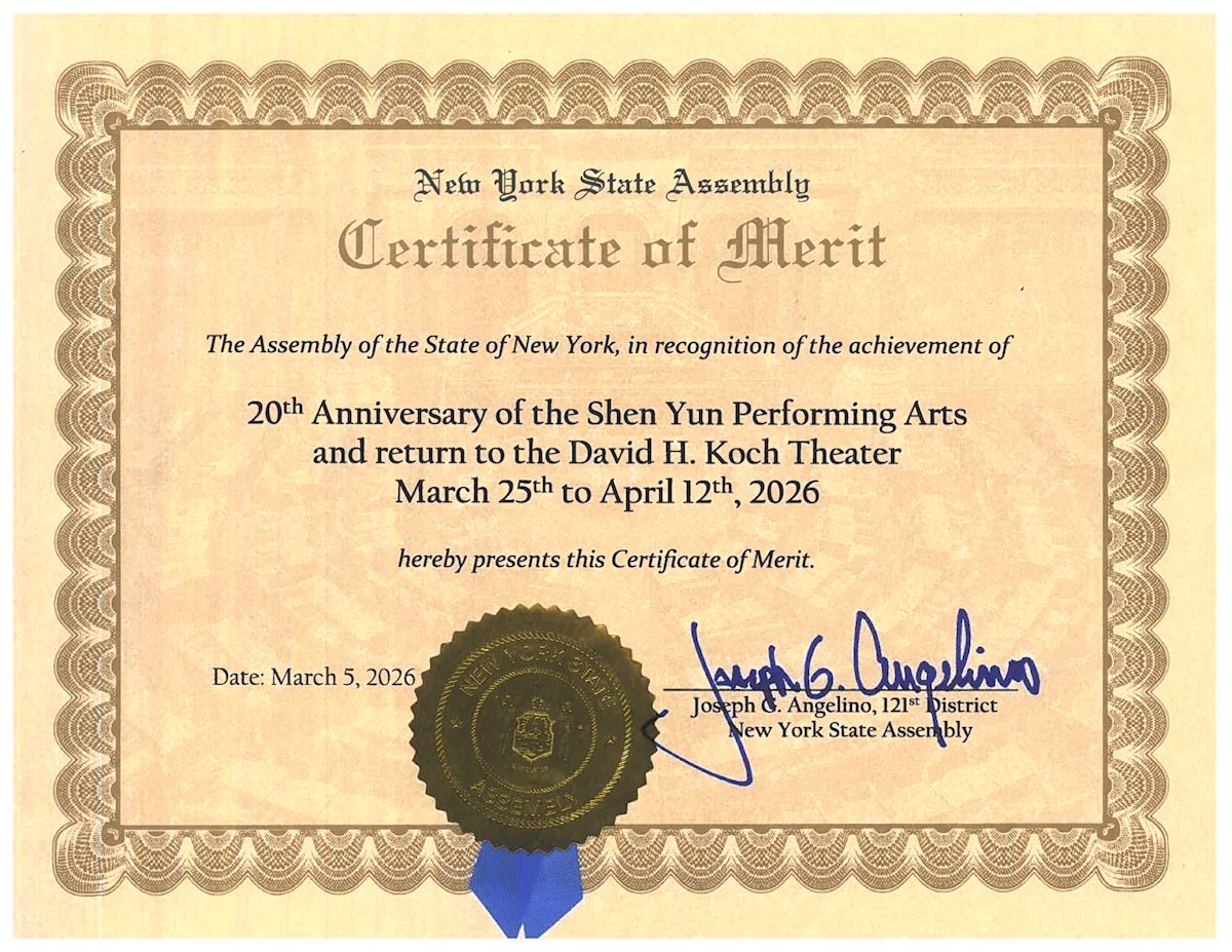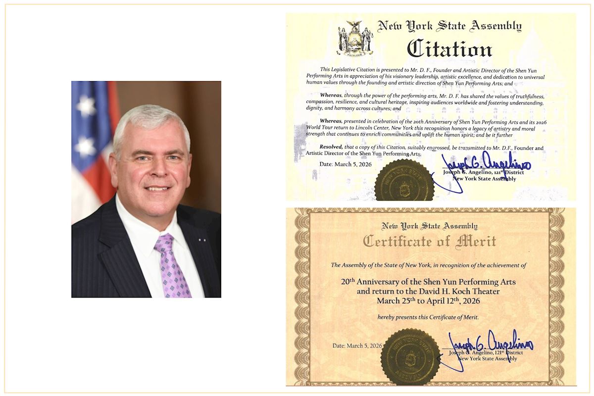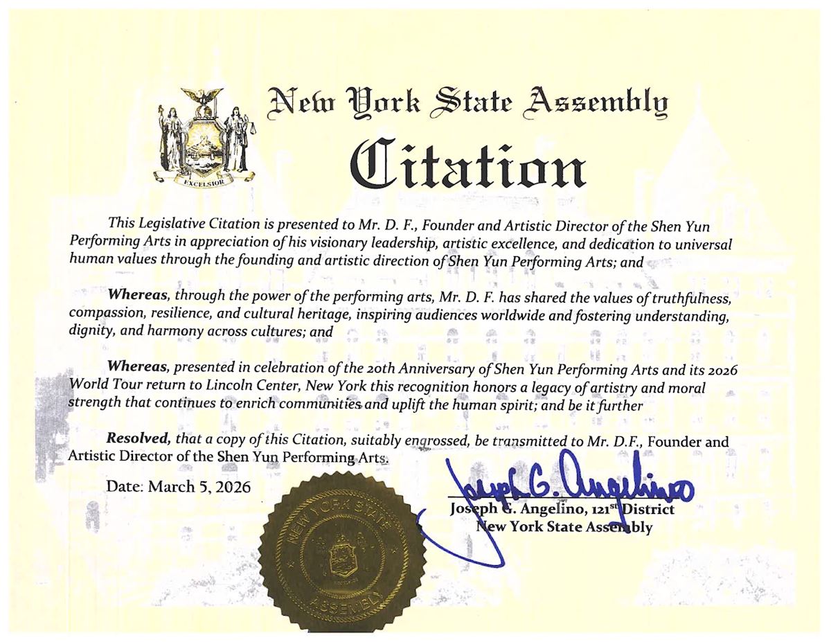 紐約州議員安傑利諾在頒發給神韻藝術團創辦人兼藝術總監D.F.先生的褒獎狀中寫道:「這份議會褒獎狀頒發給神韻藝術團創辦人兼藝術總監D.F.先生,以感謝他在創立和指導神韻藝術團過程中所展現的遠見領導力、卓越藝術成就,以及對普世人類價值的奉獻」。