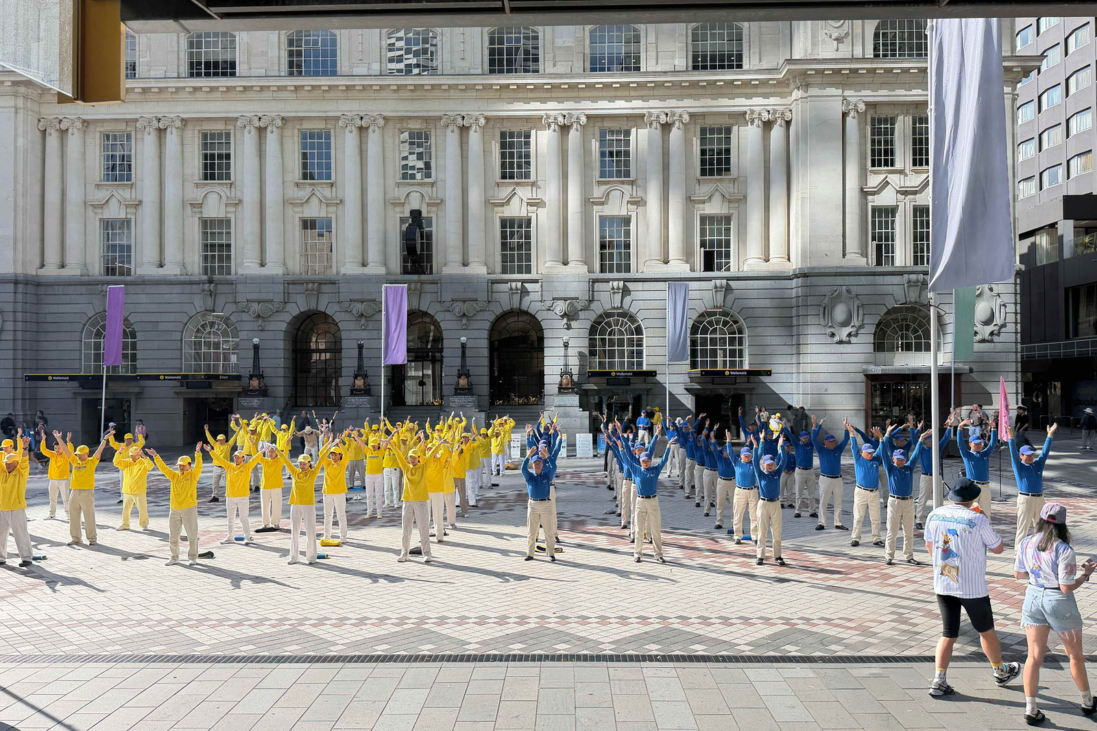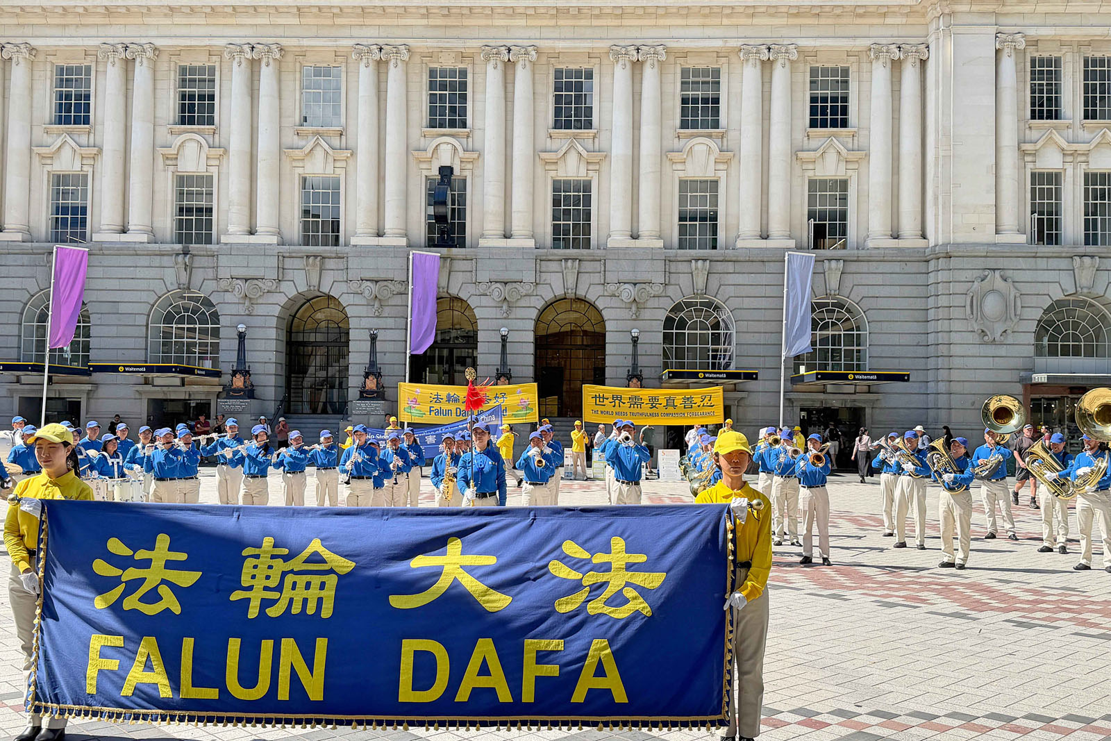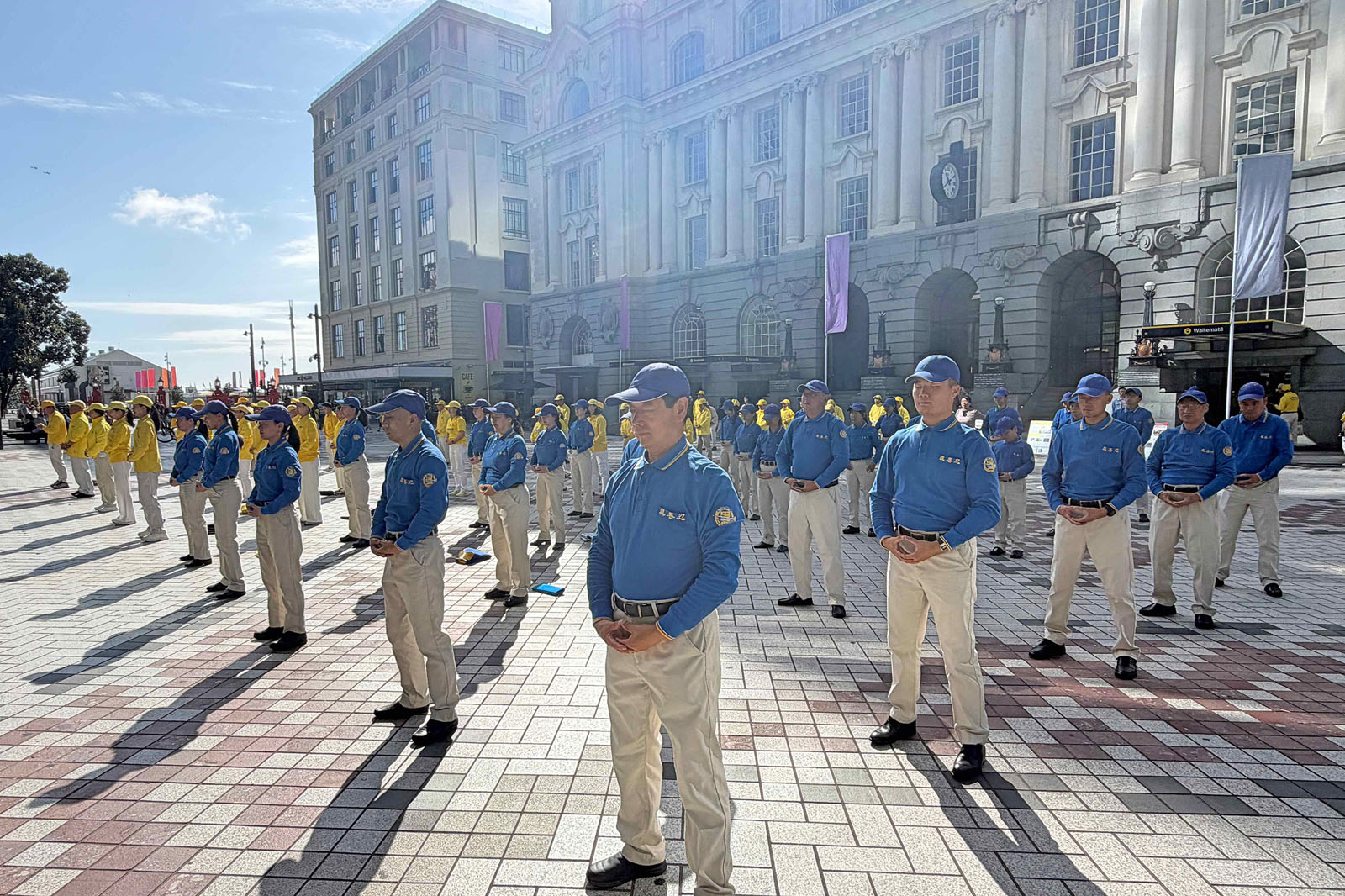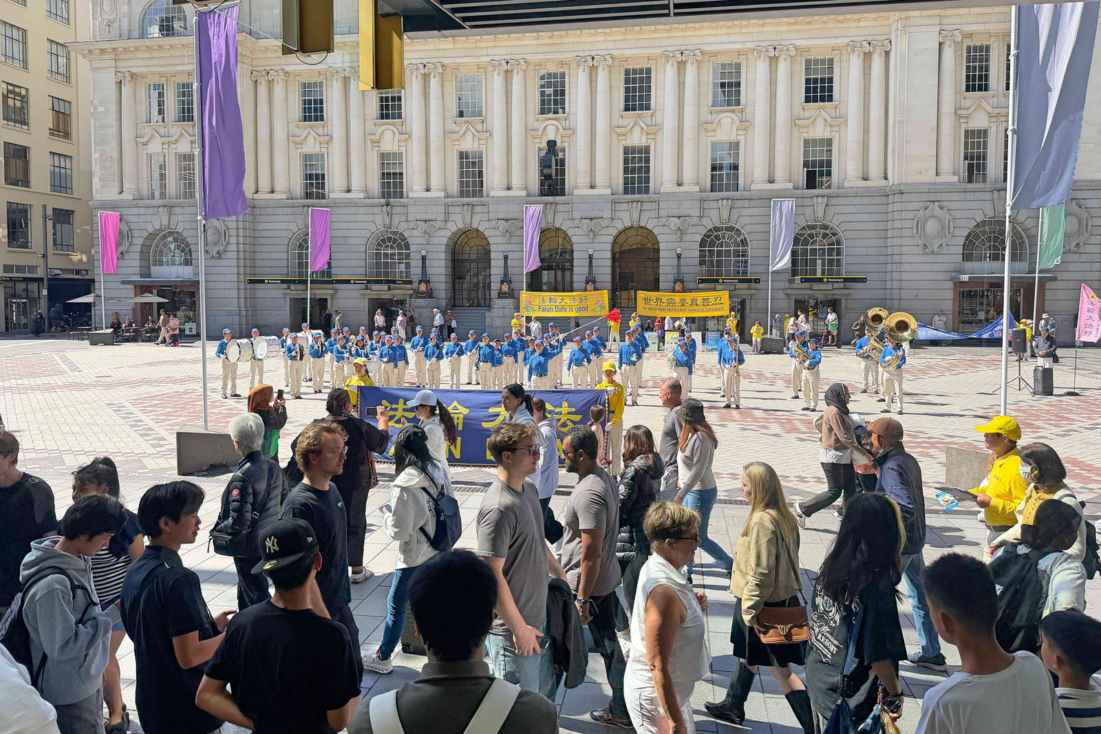 當天,天國樂團以整齊的隊形和響亮的銅管樂聲在廣場演出,旋律莊重、富有感染力,吸引了不少民眾駐足聆聽。接下來,法輪功學員在舒緩音樂中演示五套功法,動作舒展自然,場面祥和。