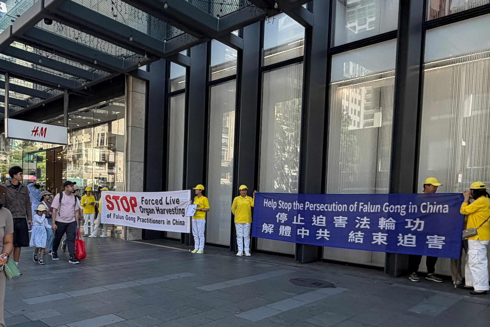 ![]() 圖4:法輪功學員在奧克蘭市中心展示真相橫幅。 |