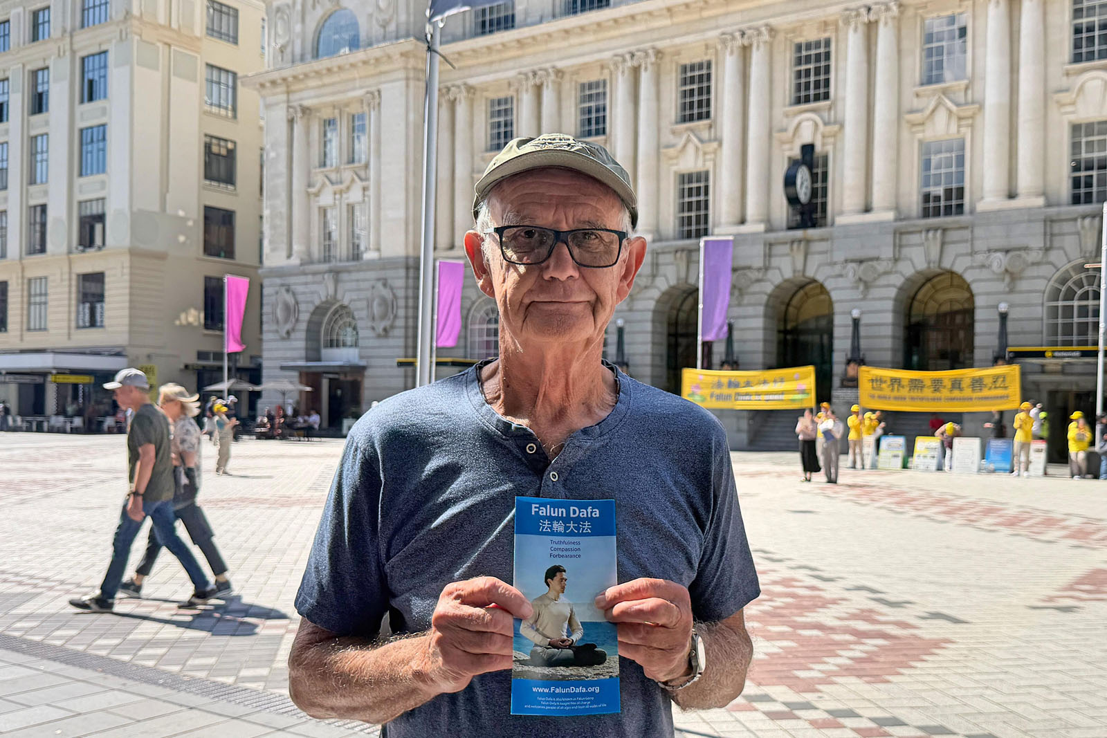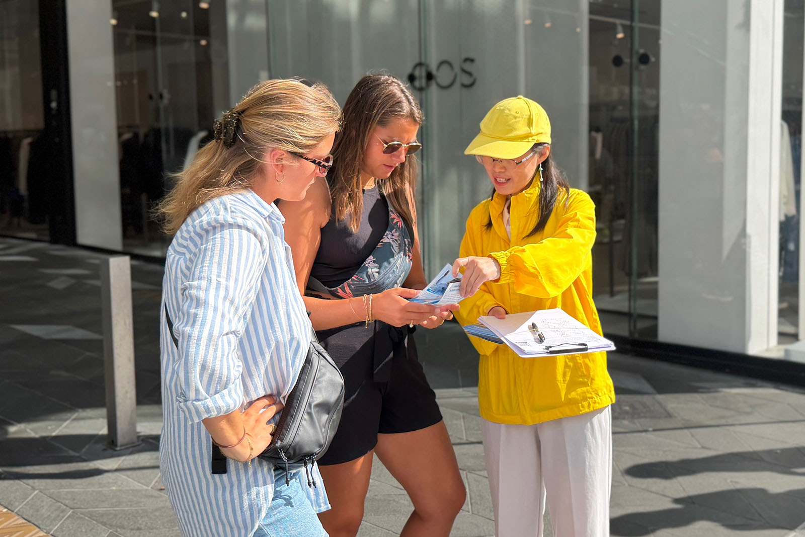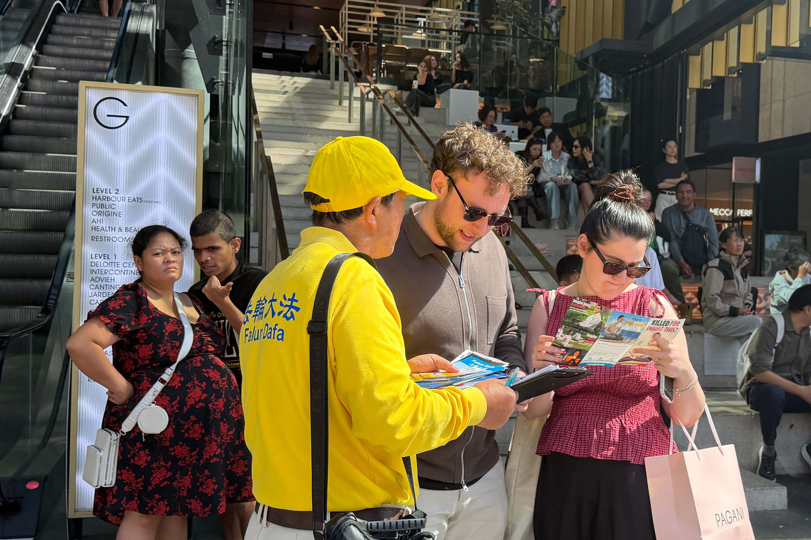 往來遊客及市區購物者或駐足觀看、拍照,或閱讀展板、與學員交談了解法輪功的修煉方式及其帶來的身心變化。學員們還向公眾講述在中國發生的迫害情況,使不少人對相關議題產生進一步關注。