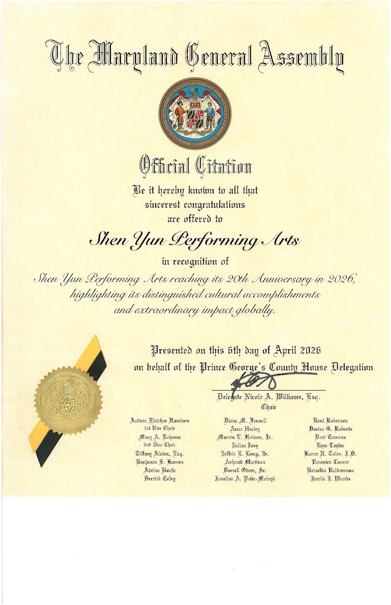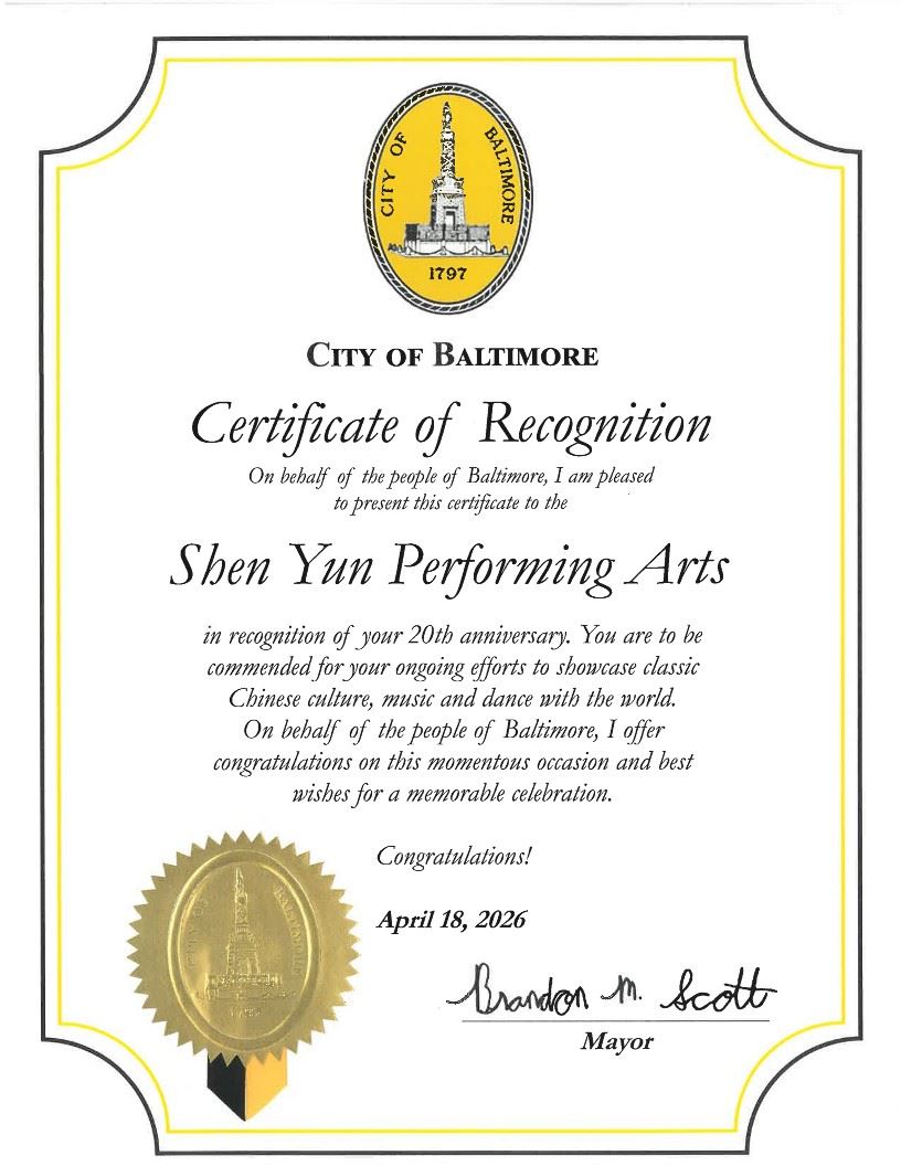 謹以此表達對神韻藝術團成立二十週年的誠摯嘉許。自2006年以來,神韻藝術團始終致力於向世界弘揚其所秉持的價值觀。通過音樂與舞蹈這一全人類共通的語言,神韻編織出一幅奇妙的畫卷,展現了天國勝境、古老傳說及現代英雄傳奇,引領觀眾踏上一段穿越五千年中華傳統文化的旅程。巴爾的摩縣謹代表全體居民,在這個具有里程碑意義的時刻,向你們致以祝賀;同時,表彰你們對巴爾的摩縣所作出的貢獻,我們為此感到榮幸。