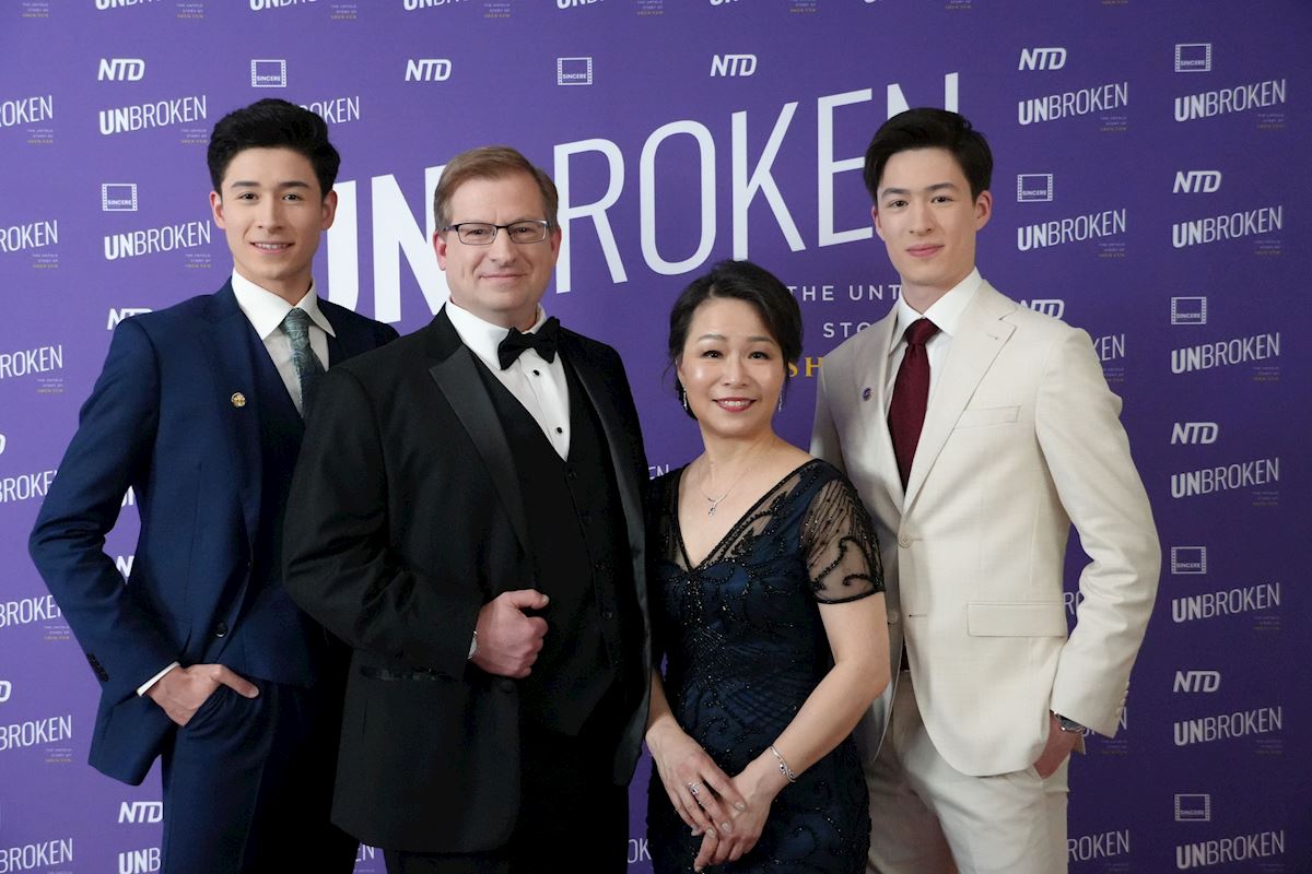 '圖2:紀錄片《堅不可摧》(Unbroken)在多倫多舉行首映。片中主角之一、神韻藝術團演員包明宇(左一)和家人參加紅毯儀式'