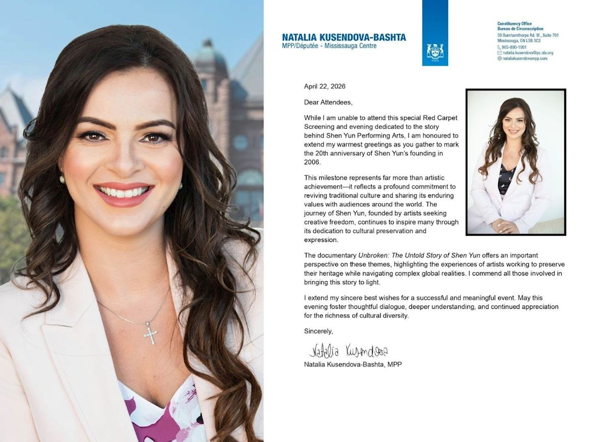 【明慧網二零二六年四月二十六日】(明慧多倫多記者站報導)「這一重要里程碑所代表的,遠不止藝術上的成就,更體現了對復興傳統文化的深刻承諾,以及將其恆久價值分享給全球觀眾的使命。神韻藝術團由一群追求藝術創作自由的藝術家創立,其發展歷程通過對文化傳承與表達的堅持,持續激勵著無數人。」加拿大安省省議員娜塔莉亞﹒庫森多娃在為《堅不可摧》紀錄片的賀信中寫到。