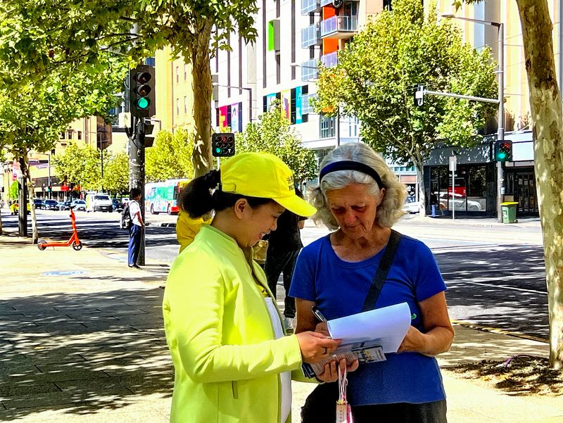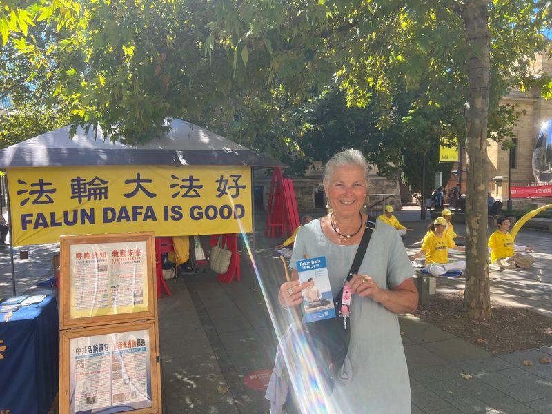 週末在市區進行騎行運動的市議員簡﹒班格(Cr Jane Bange)很高興地主動過來跟學員攀談。「我一眼就認出你們來了,我去過台灣五次,我在故宮博物院等處看到過法輪功的大型活動,非常引人注目,非常好。我看到他們很多人在那裏靜靜地打坐,我很高興台灣政府沒有干預,允許他們這樣做,因為那是一個民主國家。我認為領導人維護民主和言論自由的原則至關重要,應該允許人們和平地做自己想做的事情,只要不傷害他人。並且不向外國政府屈服,讓人們有實踐自己的信仰、自由自在生活的保障。」