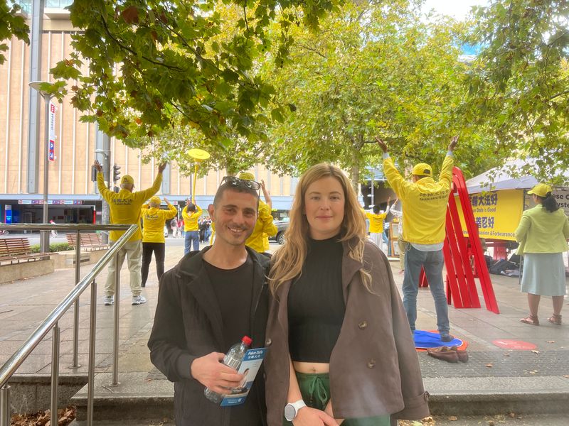 凱蒂﹒西伊(Kitie Ciui)和喬﹒穆薩雷拉(Joe Musarewla)被明亮、祥和的煉功場面吸引,看到真相橫幅上法輪功學員被中共惡警暴打的畫面很是震驚,他們關切詢問,得知法輪功學員在這裏紀念「四﹒二五」和平上訪二十七週年,並呼籲制止中共的迫害。
