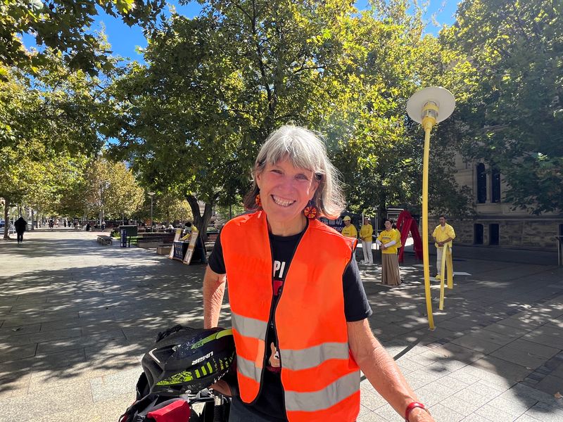 週末在市區進行騎行運動的南澳地方議會市議員、「大赦國際「組織的成員簡﹒班格(Cr Jane Bange)巧遇法輪功學員紀念「四﹒二五」活動,她主動上前表達心聲。