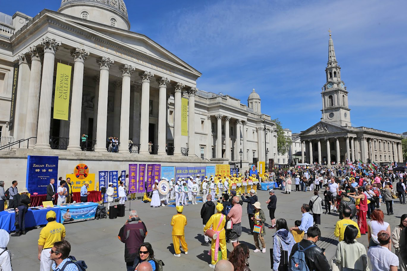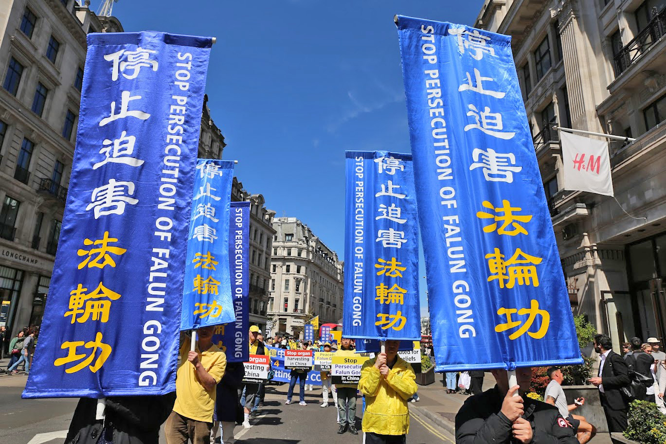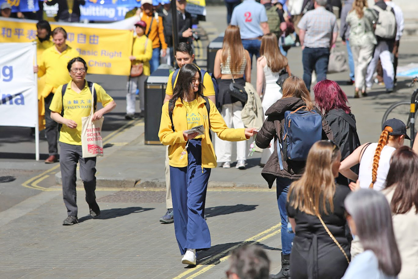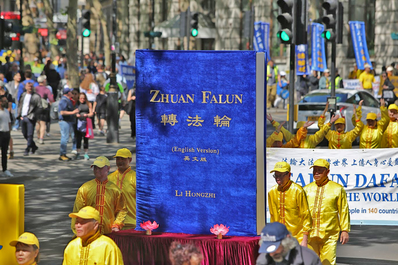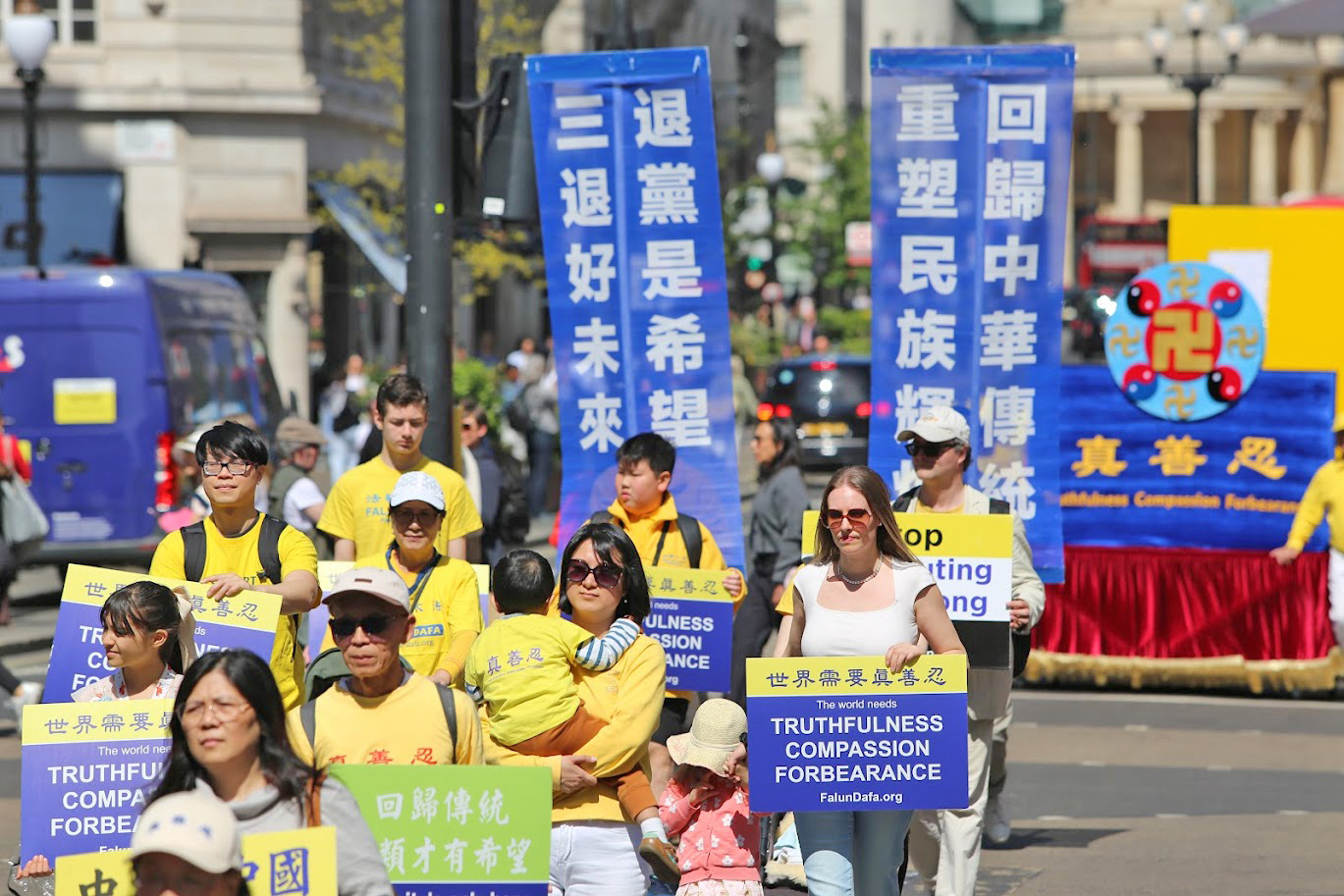 遊行隊伍從中國大使館出發,途徑倫敦市中心最繁華的商業幹道與唐人街,最終抵達特拉法加廣場(Trafalgar Square),舉行新聞發布會。學員們手持「法輪大法好」、「制止迫害法輪功」等橫幅,祥和的隊伍和悠揚的煉功音樂吸引了沿途眾多民眾駐足觀看。