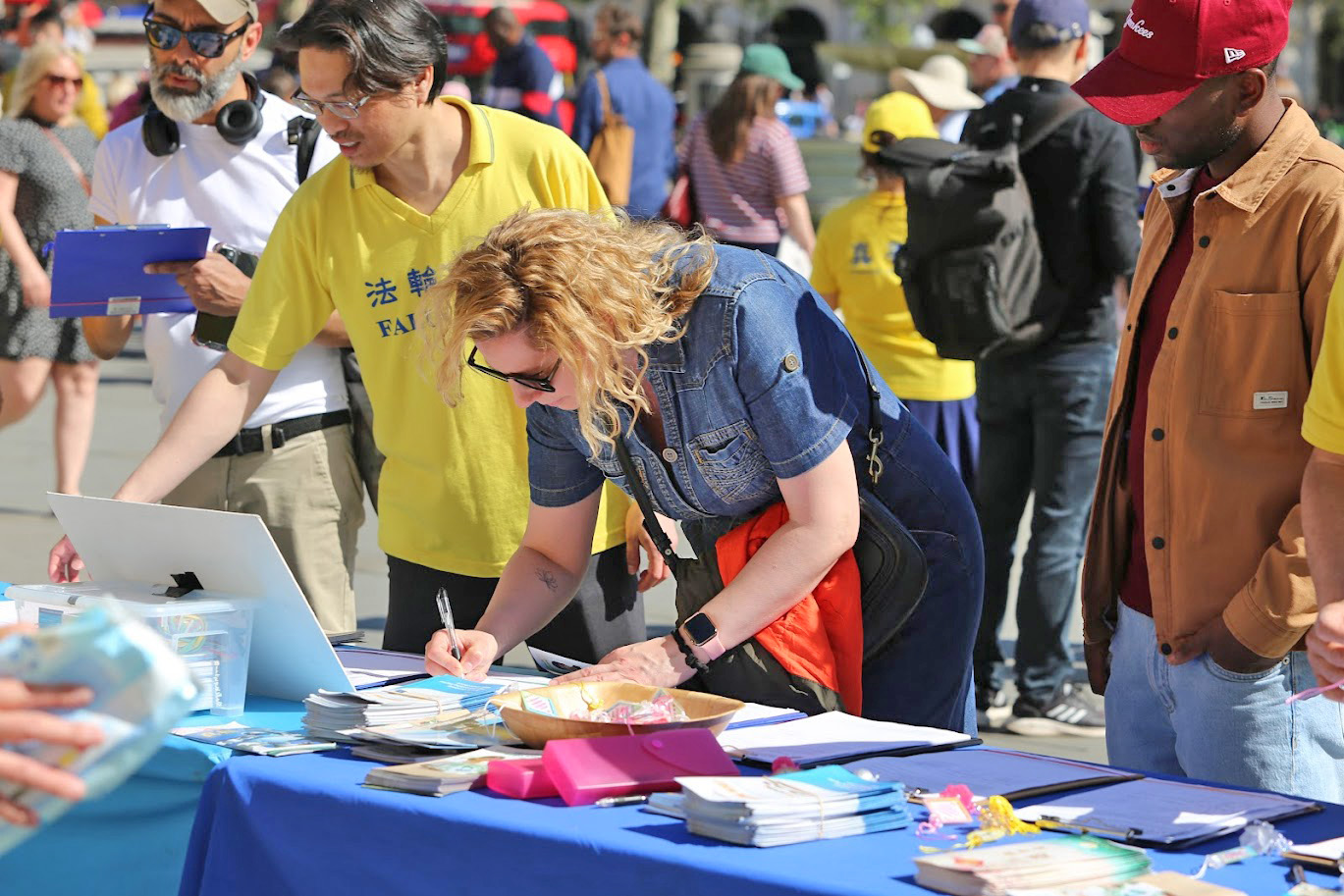 很多人駐足觀看、拍照錄像、接受傳單,在請願表上簽名支持法輪功學員制止迫害。