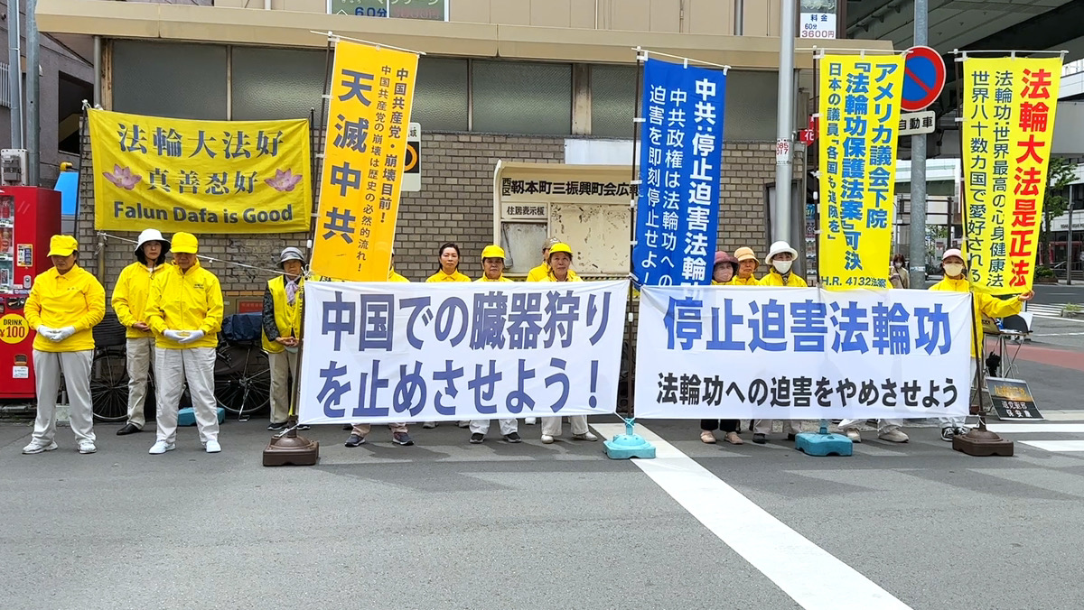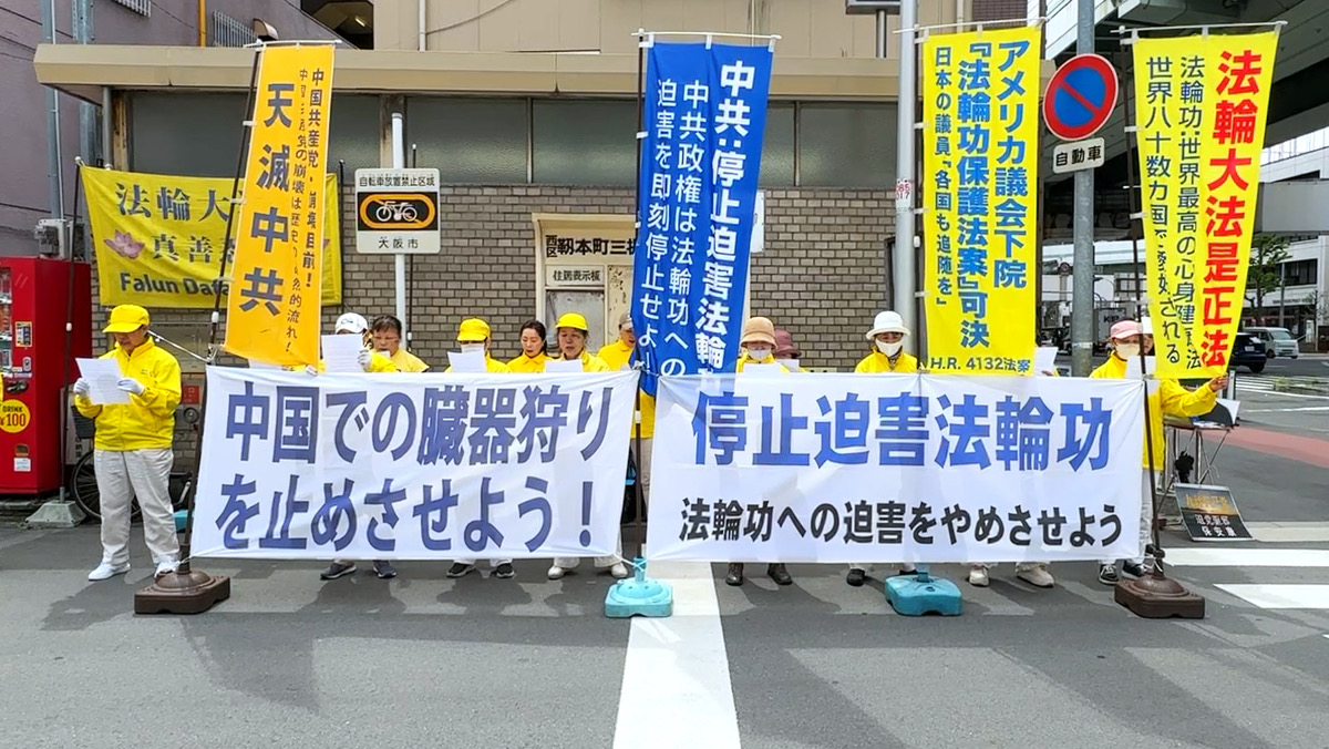 四月二十一日,部份關西地區法輪功學員來到大阪中領館前,像往常一樣打出橫幅和平請願,呼籲中共立即停止迫害法輪功。