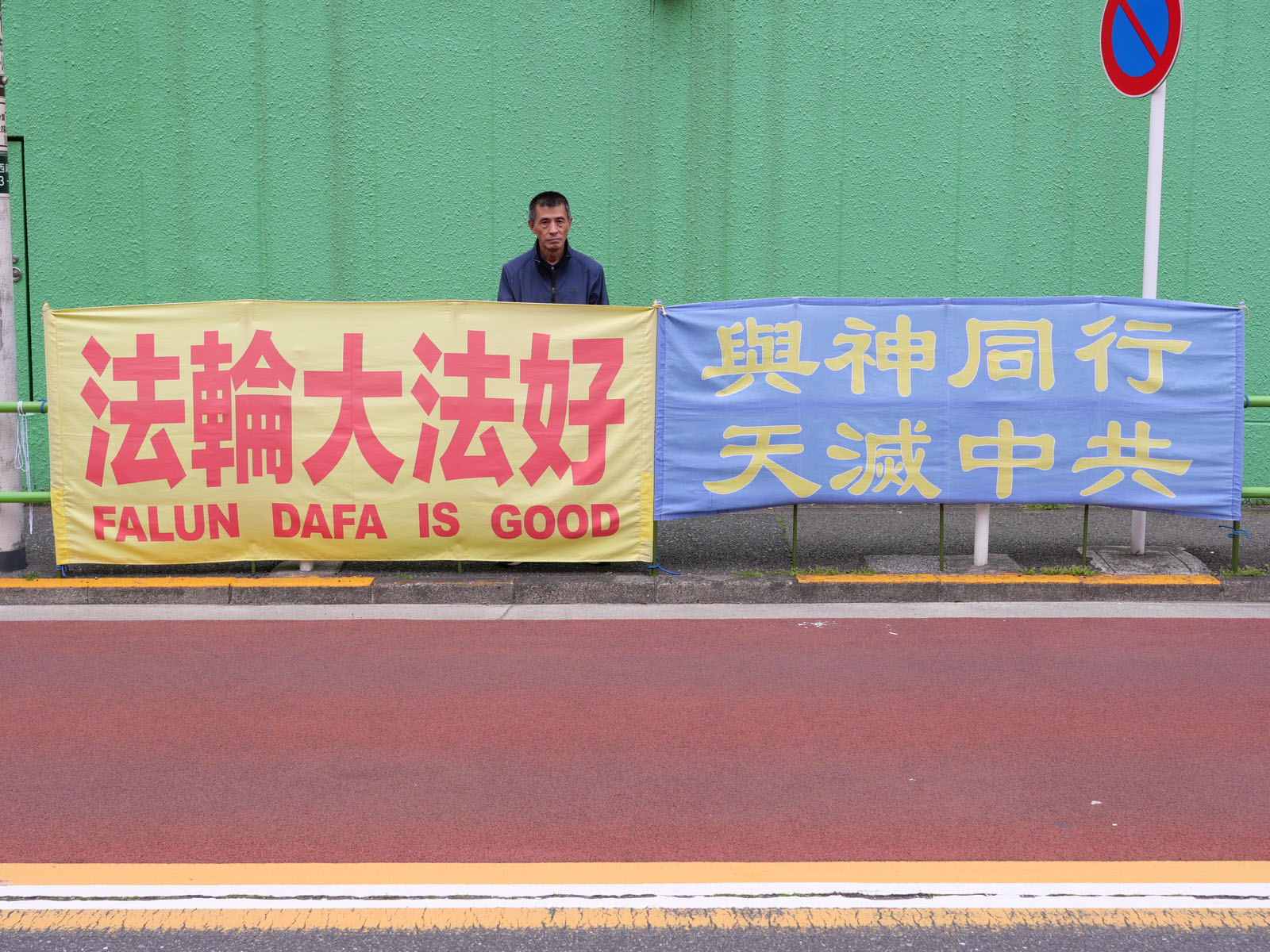 四月二十五日中午,法輪功學員孫先生來到位於東京的中國駐日本大使館前打出橫幅,呼籲中共停止迫害。
