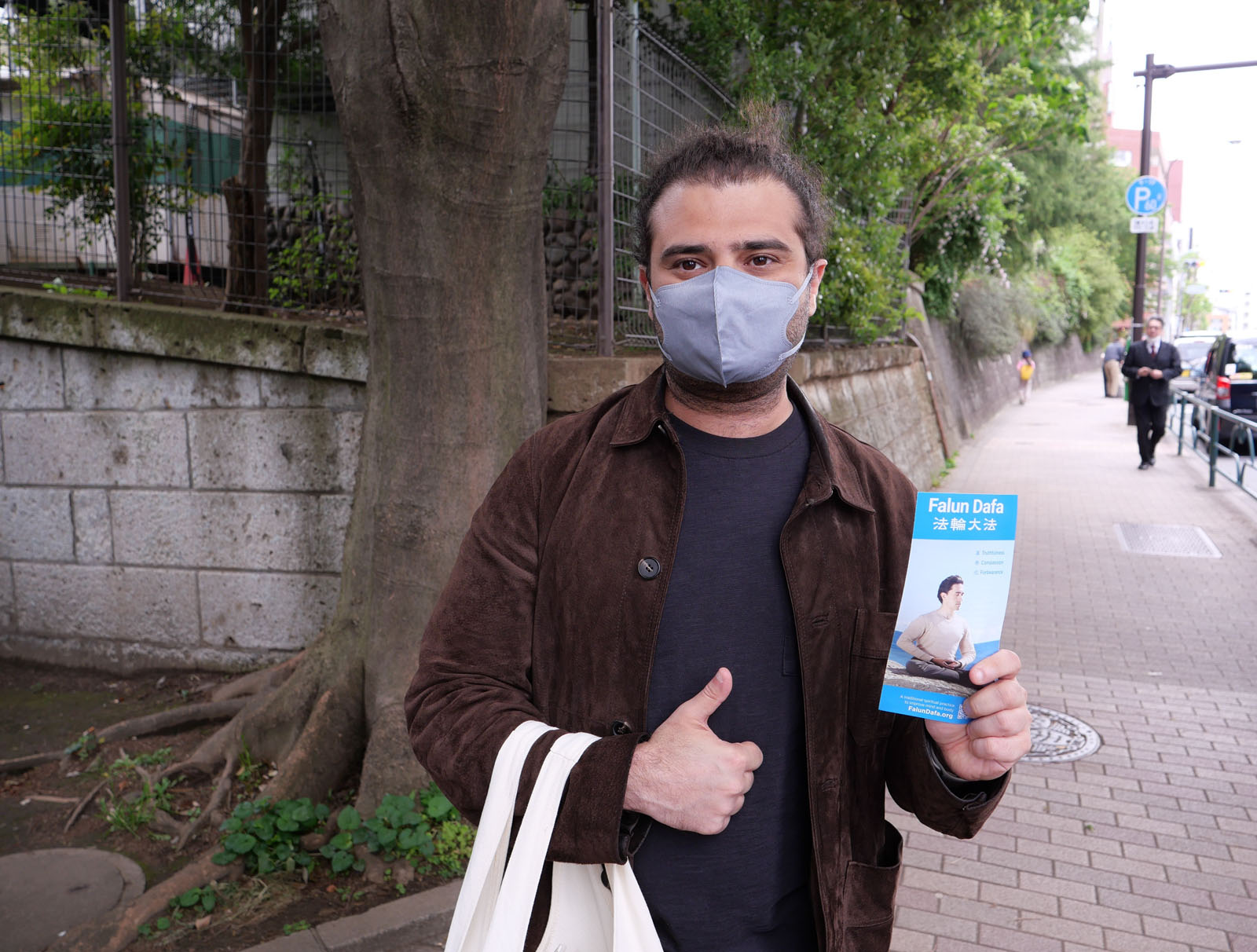 當天路過東京大使館的美國人Jake在聽完法輪功遭受迫害的真相後說:「支持你們,加油!」