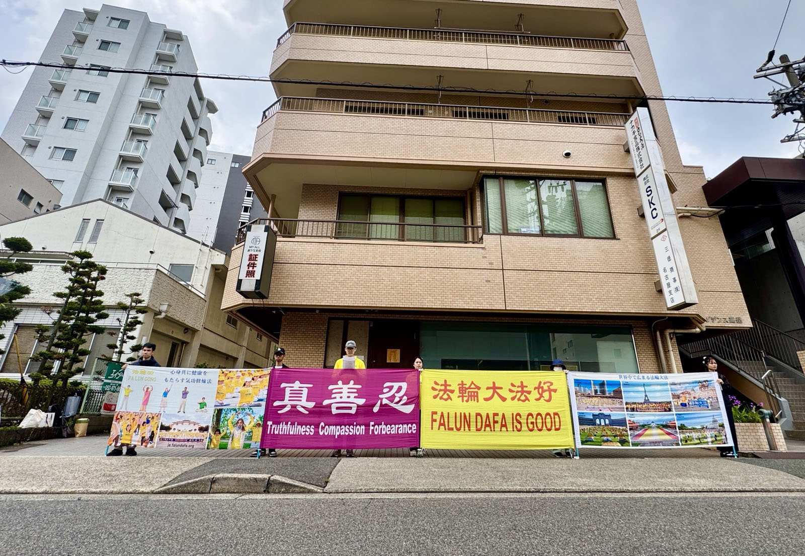 四月二十四日,部份福岡地區法輪功學員來到中共駐福岡中領館前紀念四﹒二五和平請願,同時呼籲中共立即停止迫害。