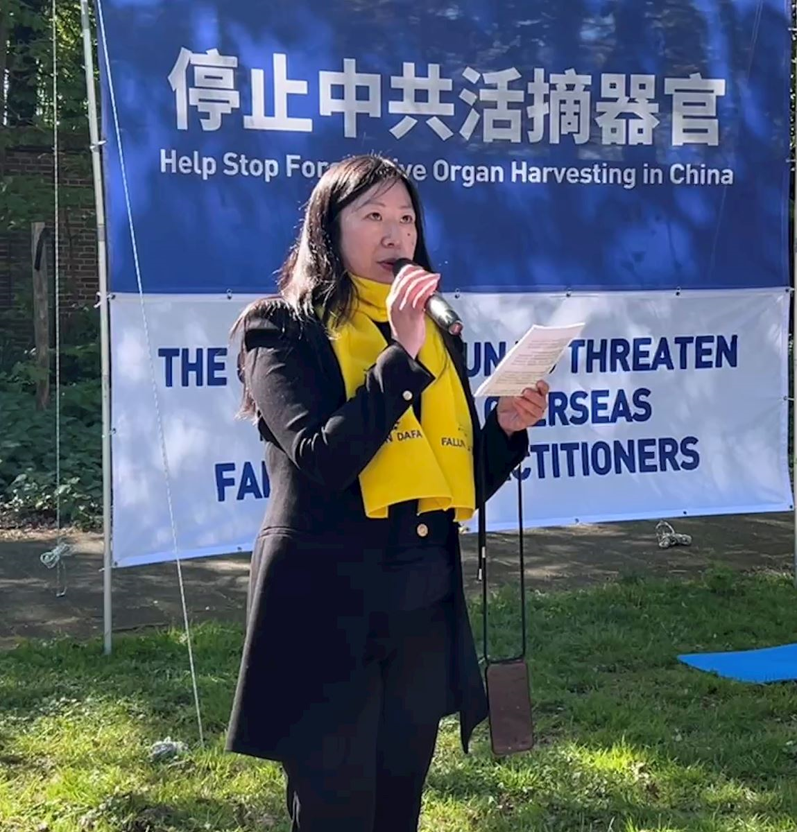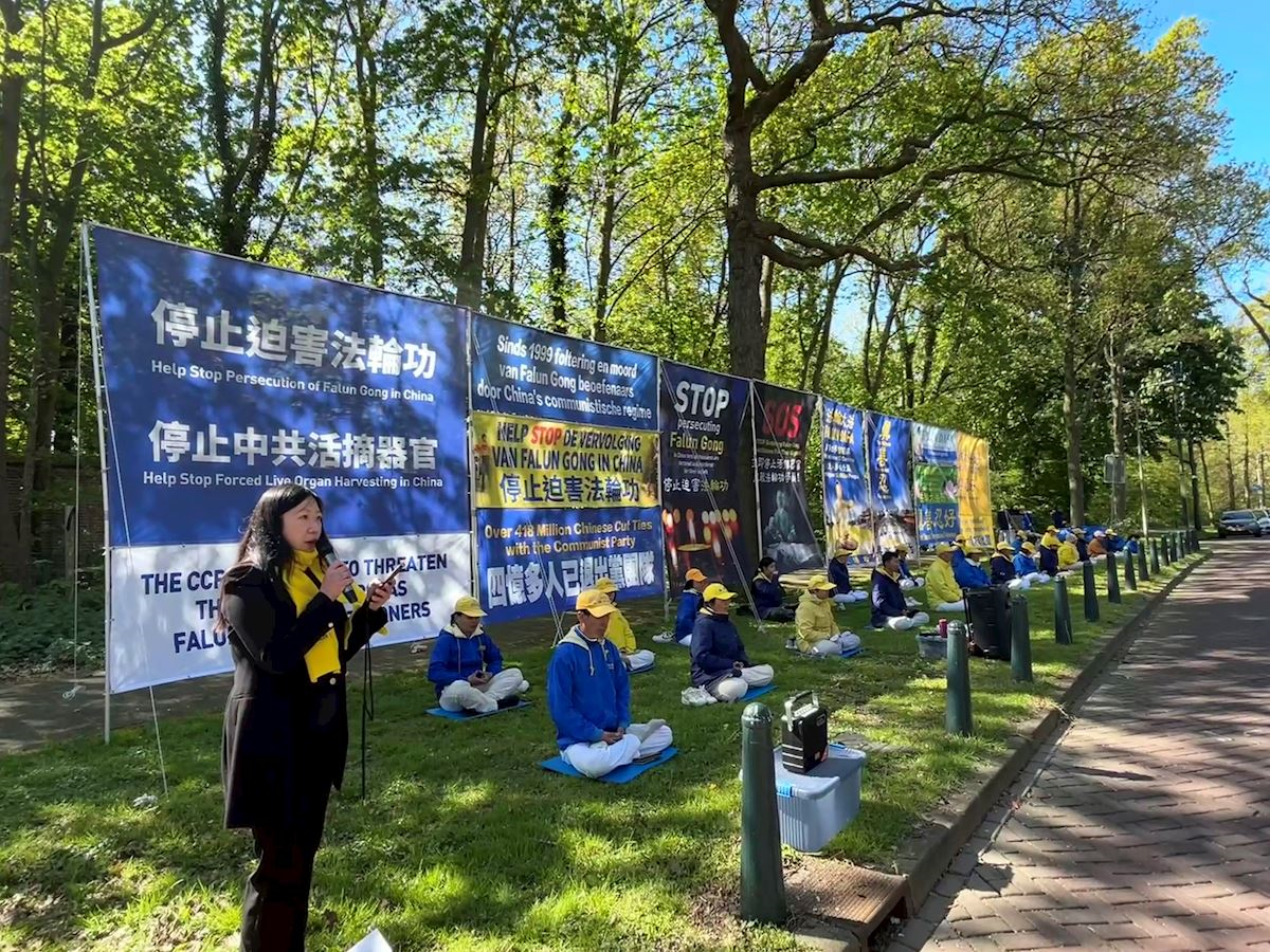 荷蘭法輪大法佛學會負責人王家恩(KaYan Wong)在集會上發言,回顧了一九九九年四月二十五日,為了爭取合法的修煉環境,中國大陸近萬名法輪功學員去北京和平上訪的經過。針對中共對法輪功修煉者的持續迫害及在海外發動的跨國鎮壓,王家恩指出,荷蘭大法弟子與世界大法弟子一樣,堅持和平理性反迫害。她呼籲中國政府的有識之士,不要追隨中共迫害法輪功,停止包括活摘器官在內的酷刑迫害,停止跨國鎮壓。