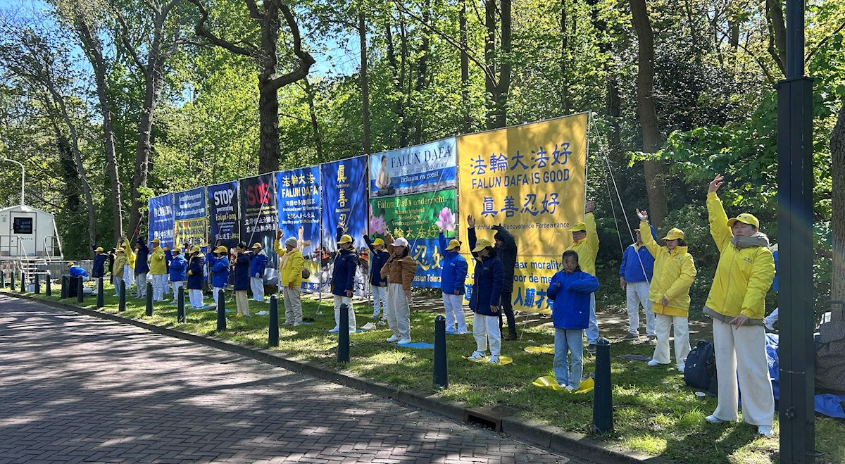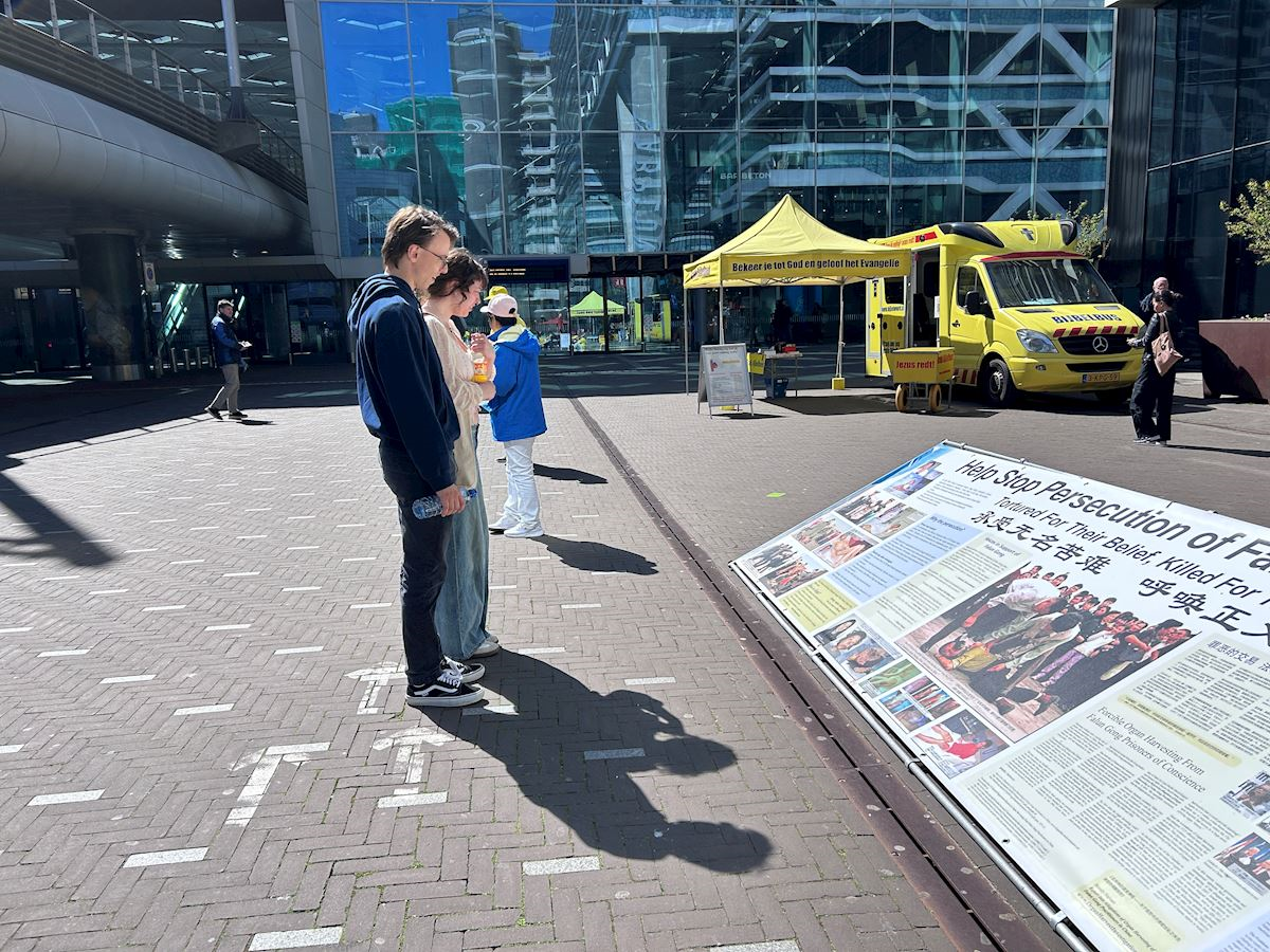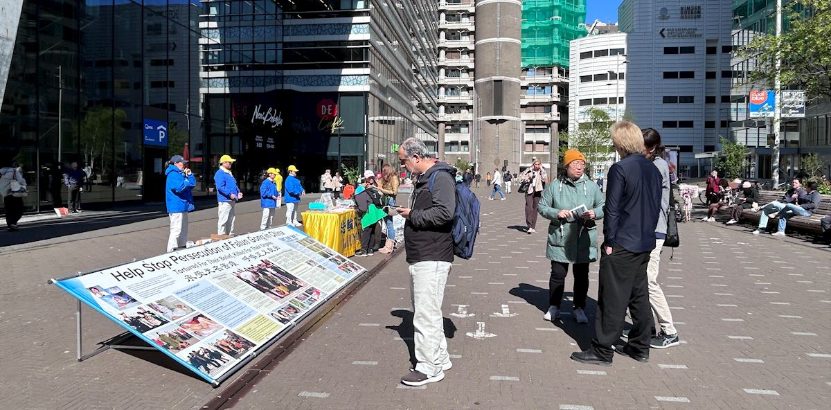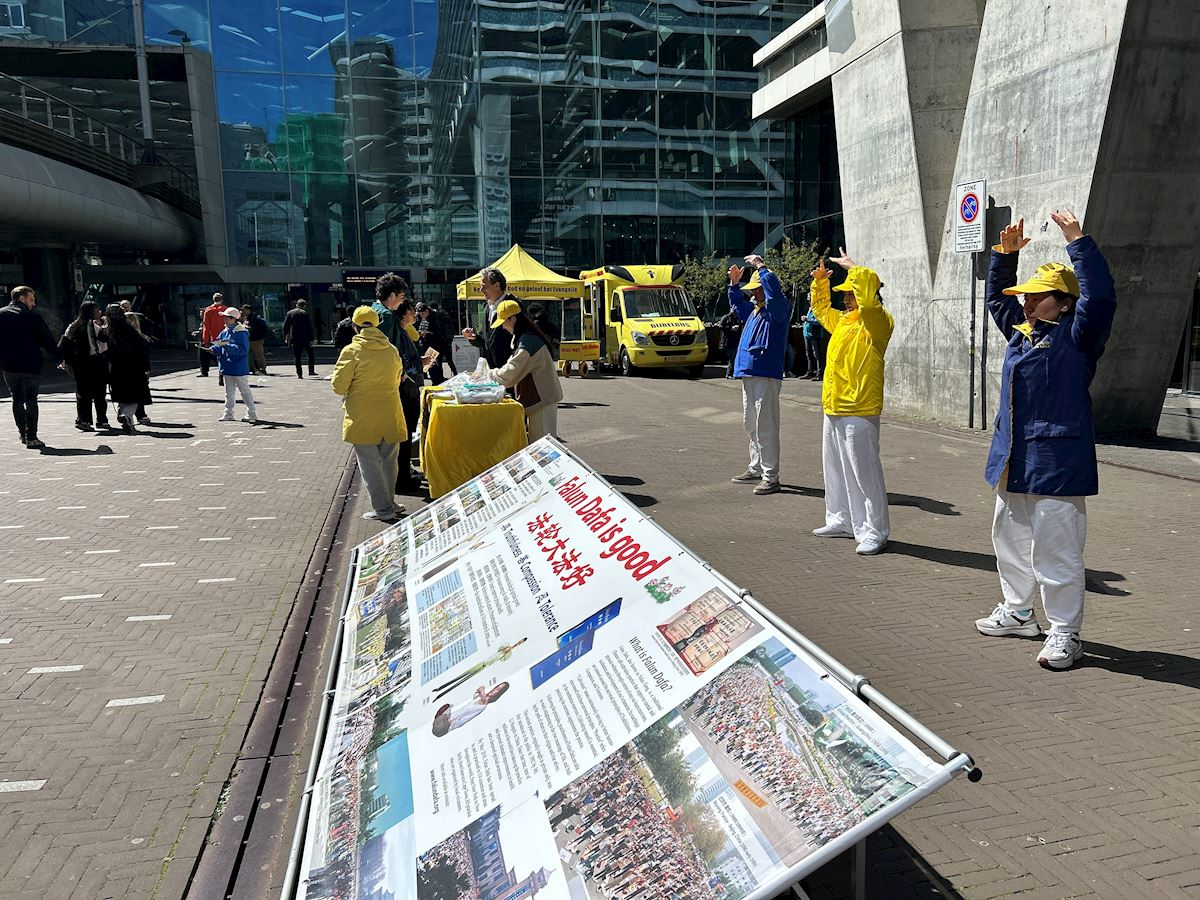 四月二十三日下午,學員們在荷蘭眾議院(議會開會地點)臨時辦公地點附近的貝祖登豪茨路(Bezuidenhoutseweg)和海牙中央火車站(DenHaag Center Station)附近布置展板,集體煉功,向過往民眾講述法輪功真相。