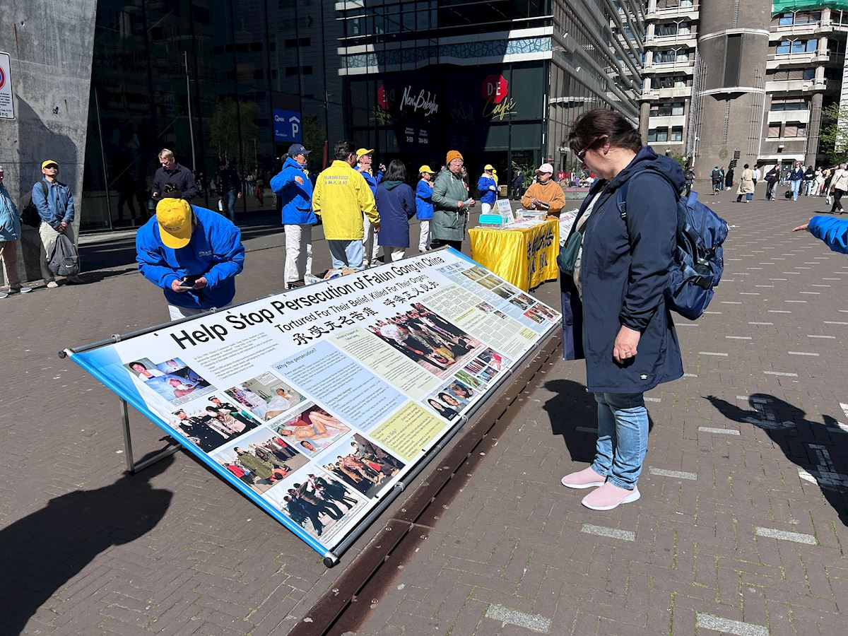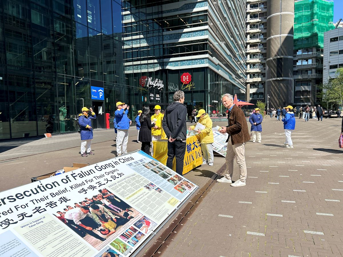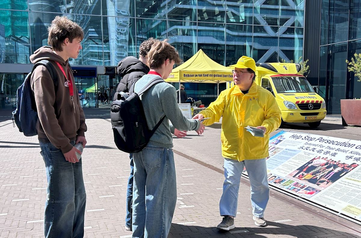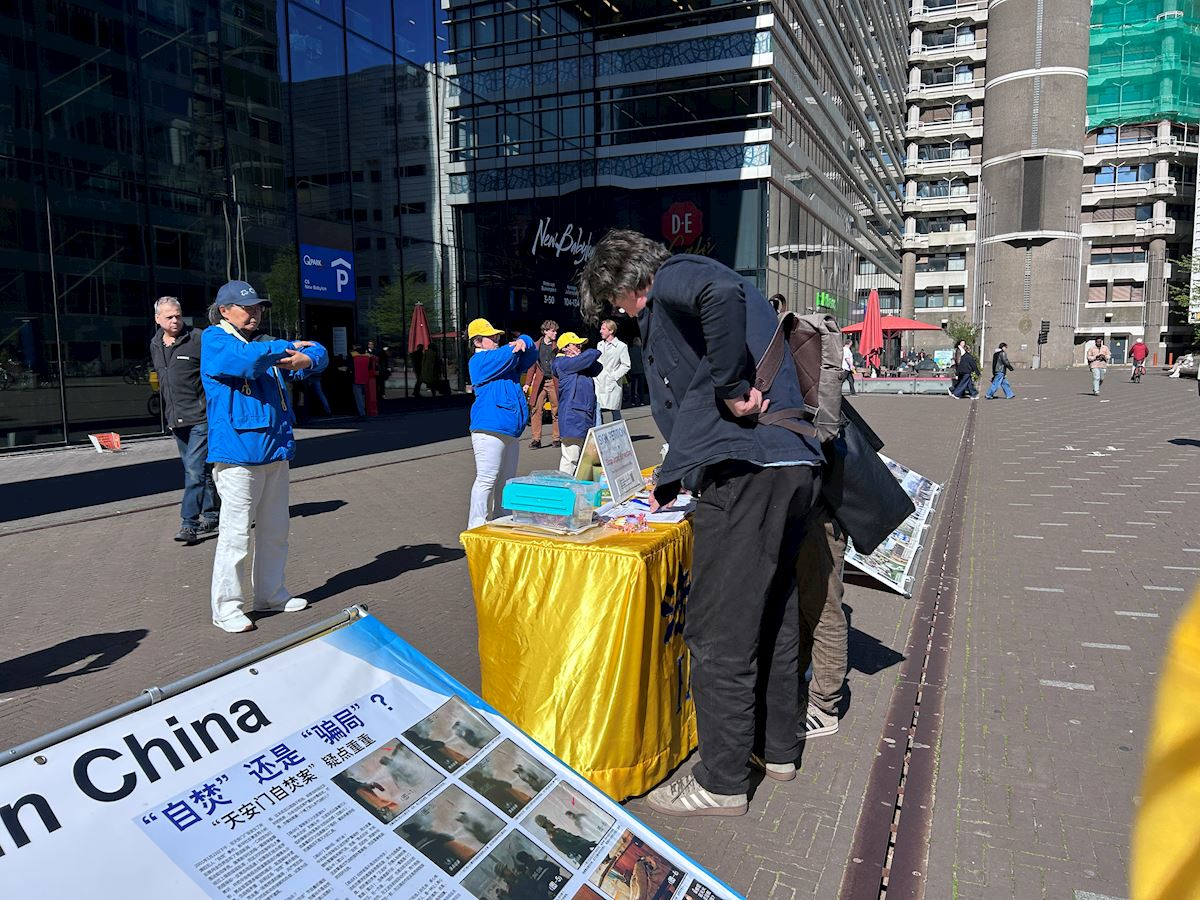 四月二十三日下午,學員們在荷蘭眾議院(議會開會地點)臨時辦公地點附近的貝祖登豪茨路(Bezuidenhoutseweg)和海牙中央火車站(DenHaag Center Station)附近布置展板,集體煉功,向過往民眾講述法輪功真相。