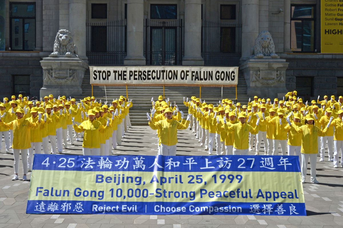 圖1~2:二零二六年四月二十五日,加拿大溫哥華法輪功學員在藝術館北側廣場舉辦集體煉功,紀念四﹒二五和平上訪二十七週年。