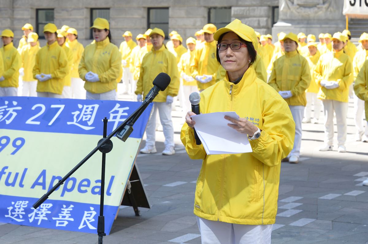 圖3:溫哥華法輪功代表在集會上發言,紀念四﹒二五和平上訪二十七週年。