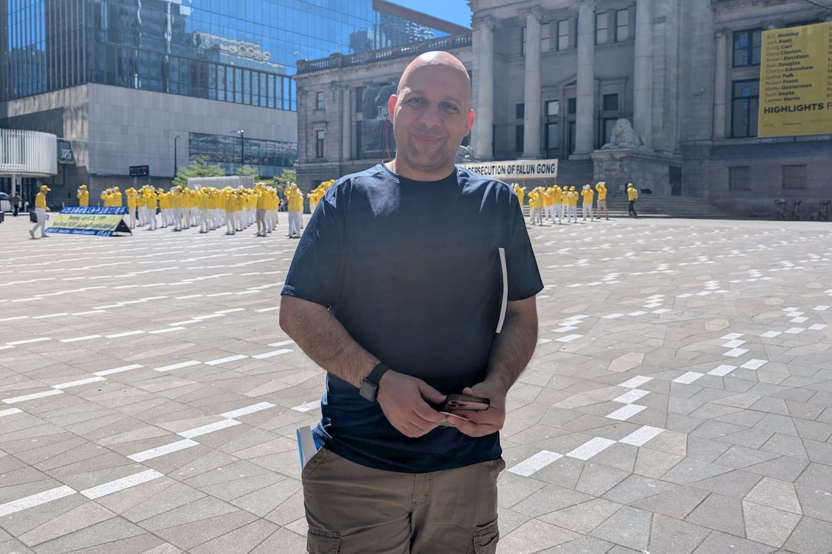 伊朗移民埃斯坦﹒哈爾(Ehstan Hal)來加拿大二十年了,當他看到法輪功學員展示的功法,他表示非常感興趣,希望跟著一起學。
