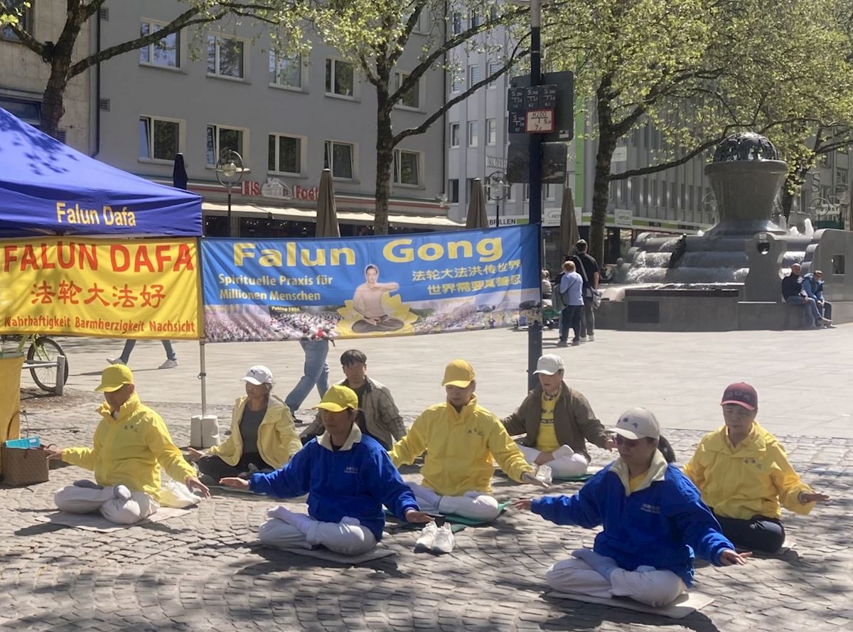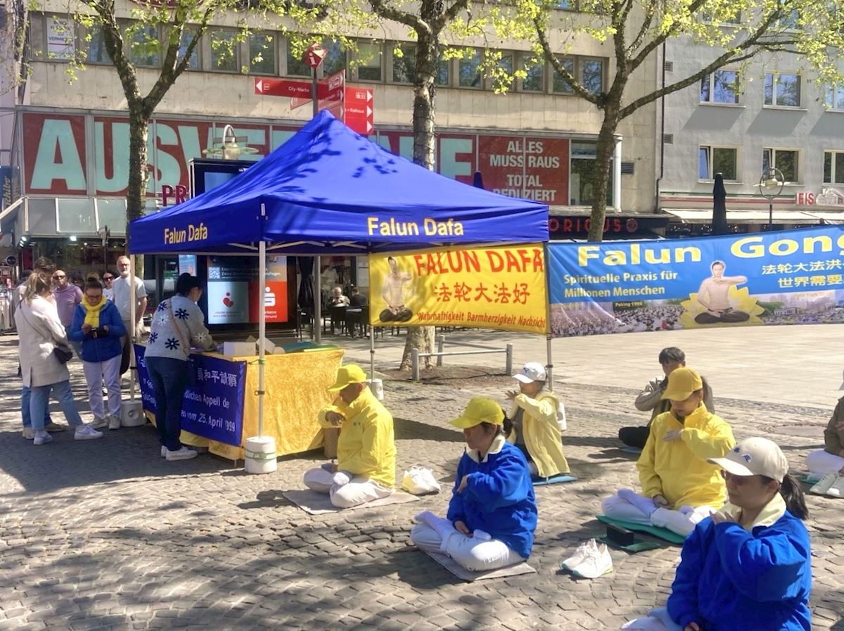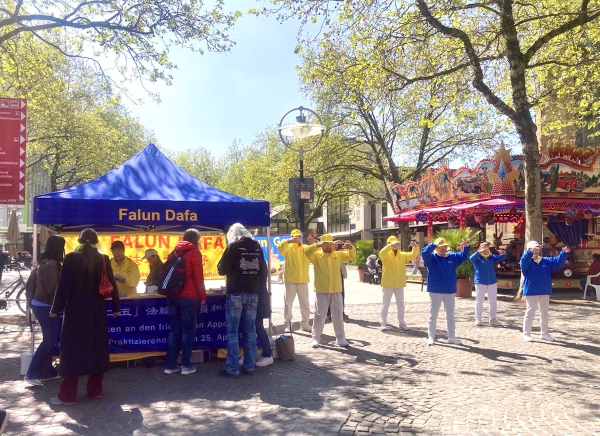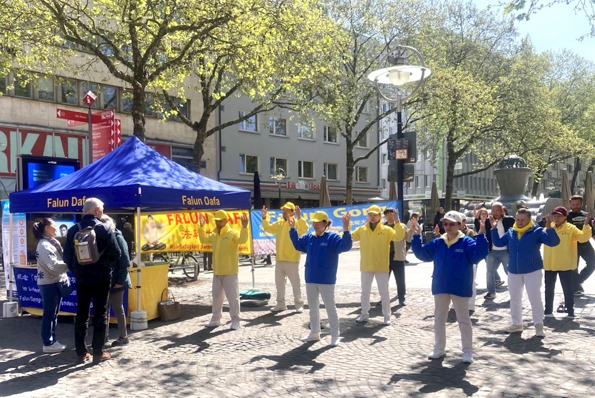 活動當天陽光明媚。伴隨著平和的煉功音樂,法輪功學員的集體煉功在鬧市中歐洲噴泉(Europa-Brunnen)開闢出一個寧靜祥和的場,吸引路人上前了解真相。