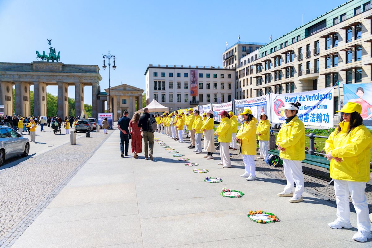 '圖1:為紀念四﹒二五和平上訪二十七週年,二零二六年四月二十五日,部份柏林法輪功學員在著名地標勃蘭登堡門舉辦了紀念活動。'