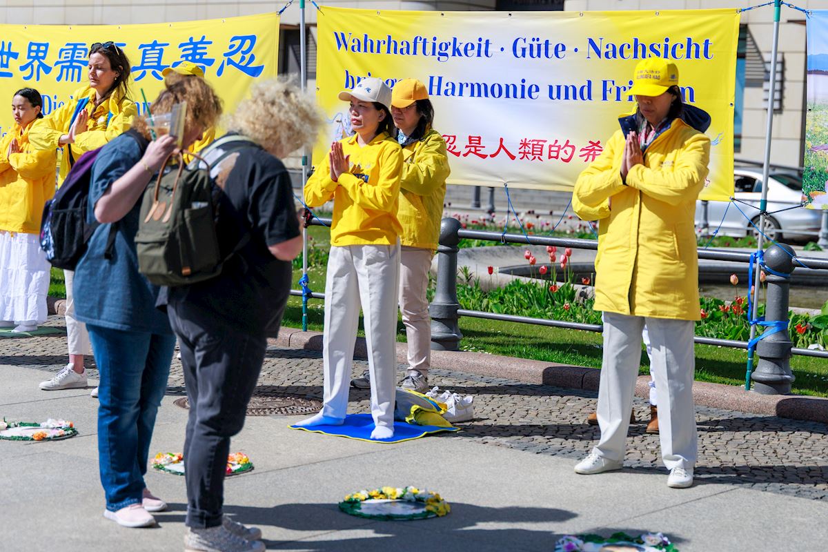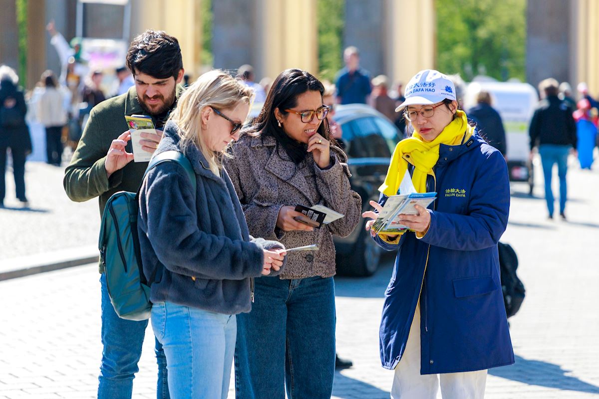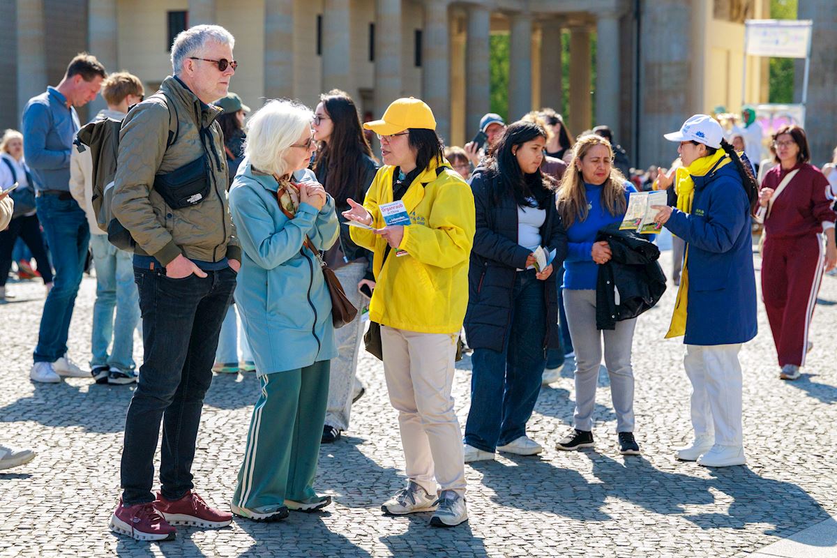 當天的柏林陽光明媚,遊客絡繹不絕。經過勃蘭登堡門的民眾,被舒緩的音樂、祥和的功法展示所吸引,紛紛駐足觀看學員煉功場景,還有的人當場模仿起煉功動作來。在了解法輪功學員紀念和平上訪的真相,還有中共二十七年來對法輪功學員的殘酷迫害以及活摘法輪功學員器官的罪行後,路人紛紛在徵簽表上簽名聲援法輪功學員反迫害,並感謝學員告訴他們這些真相。